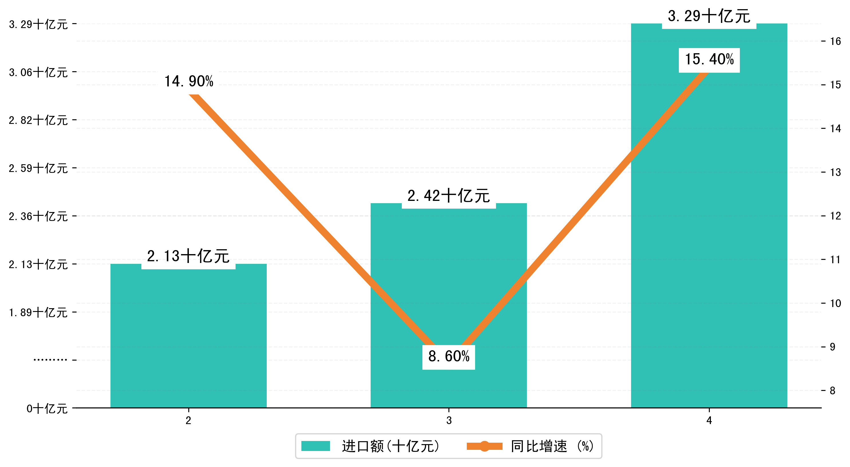 以人民币计,2024年4月南昌市进口额为32,9008.6654万元,相比上月增加了8,7129.7864万元;相比上年同期增加了8,3382.9787万元,同比增加了15.40%。