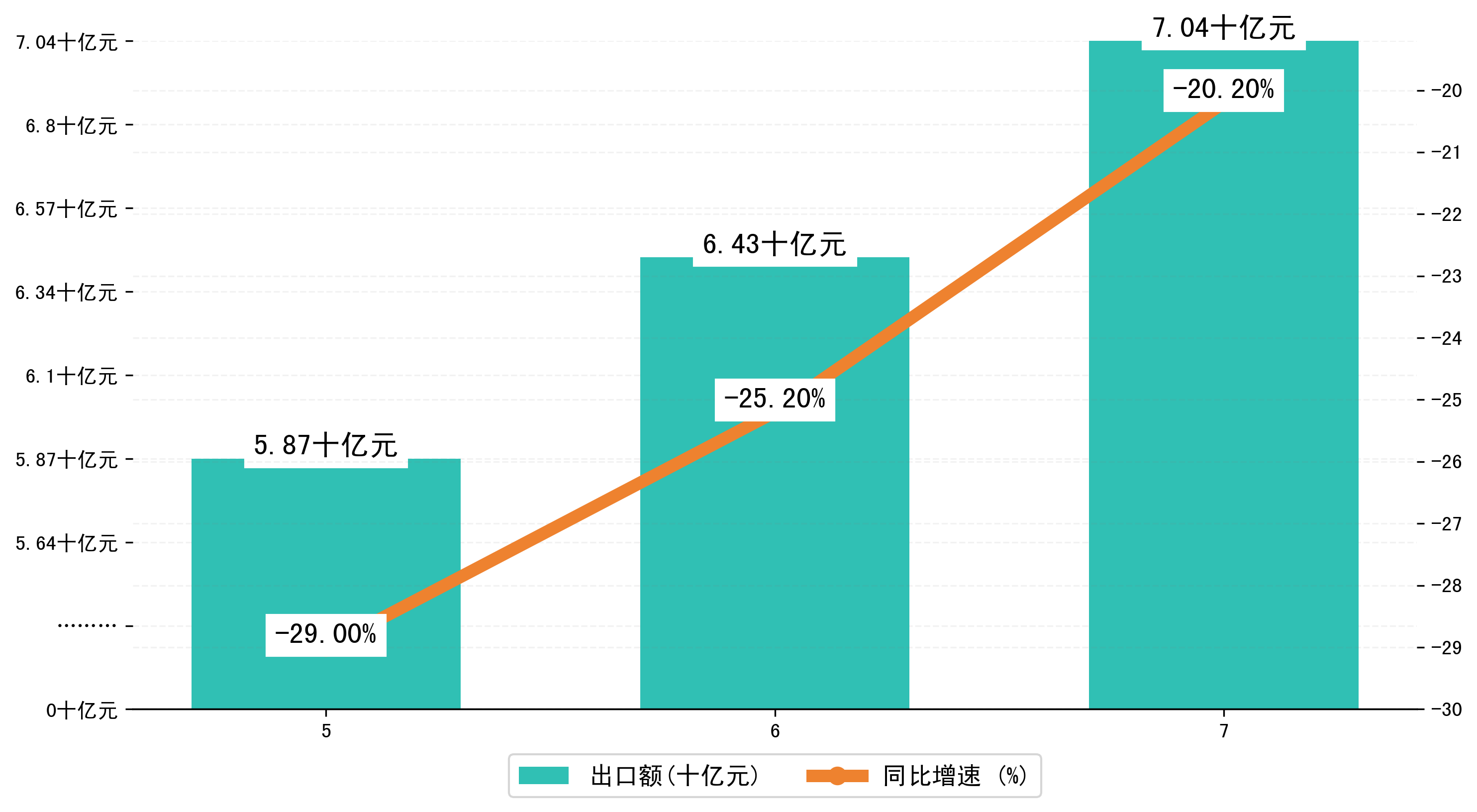 以人民币计,2024年7月南昌市出口额为70,3709.2491万元,相比上月增加了6,0391.0142万元;相比上年同期增加了8,5405.076万元,同比减少了-20.20%。