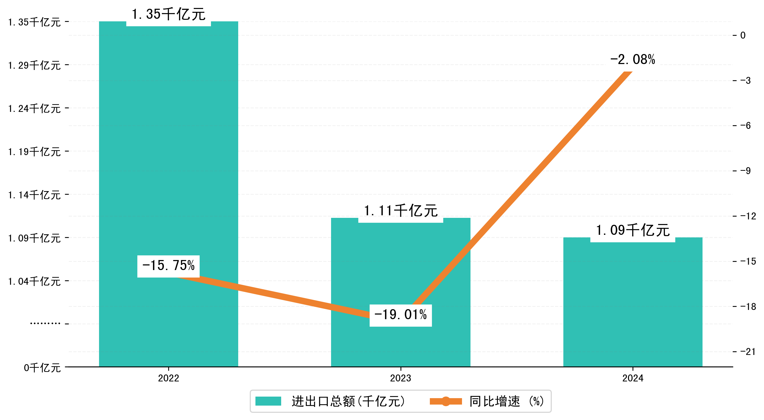 以人民币计,2024年1-12月南昌市进出口总额为1089,8120.5812万元,相比上年同期减少了23,0957.171万元,同比减少了-2.10%。