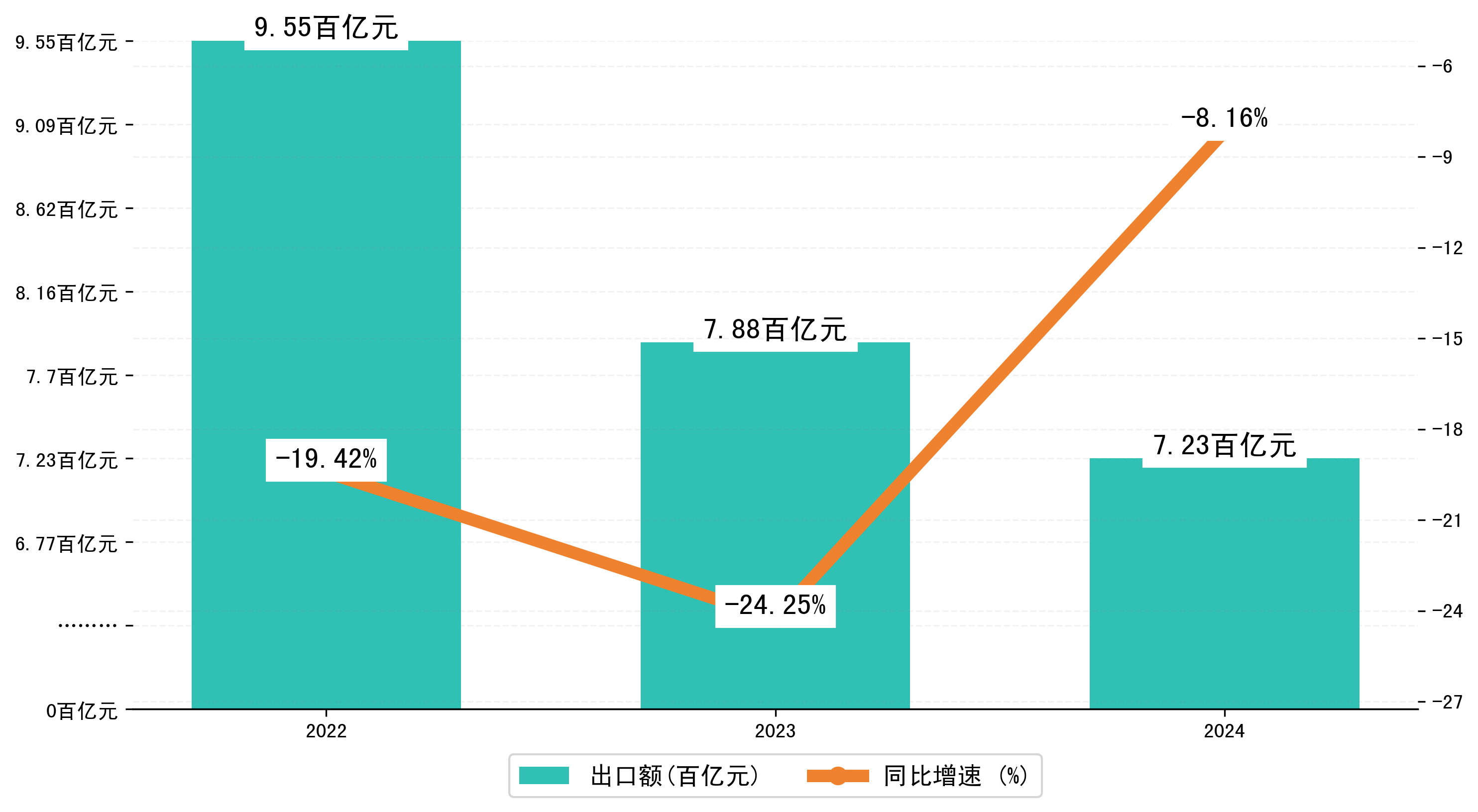 以人民币计,2024年1-12月南昌市出口额为723,3377.9103万元,相比上年同期减少了64,2849.9696万元,同比减少了-8.20%。