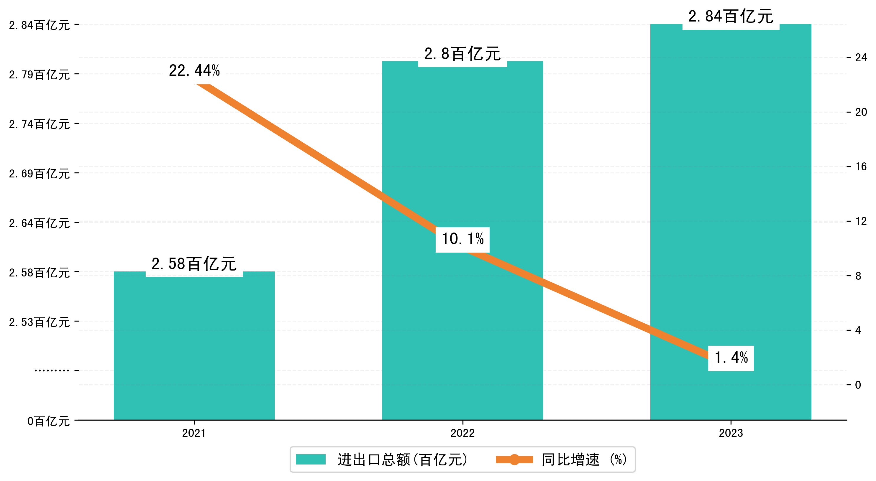 以人民币计,2023年1-3月南昌市进出口总额为284,3900.583万元,相比上年同期增加了3,9313.1574万元,同比增加了1.60%。