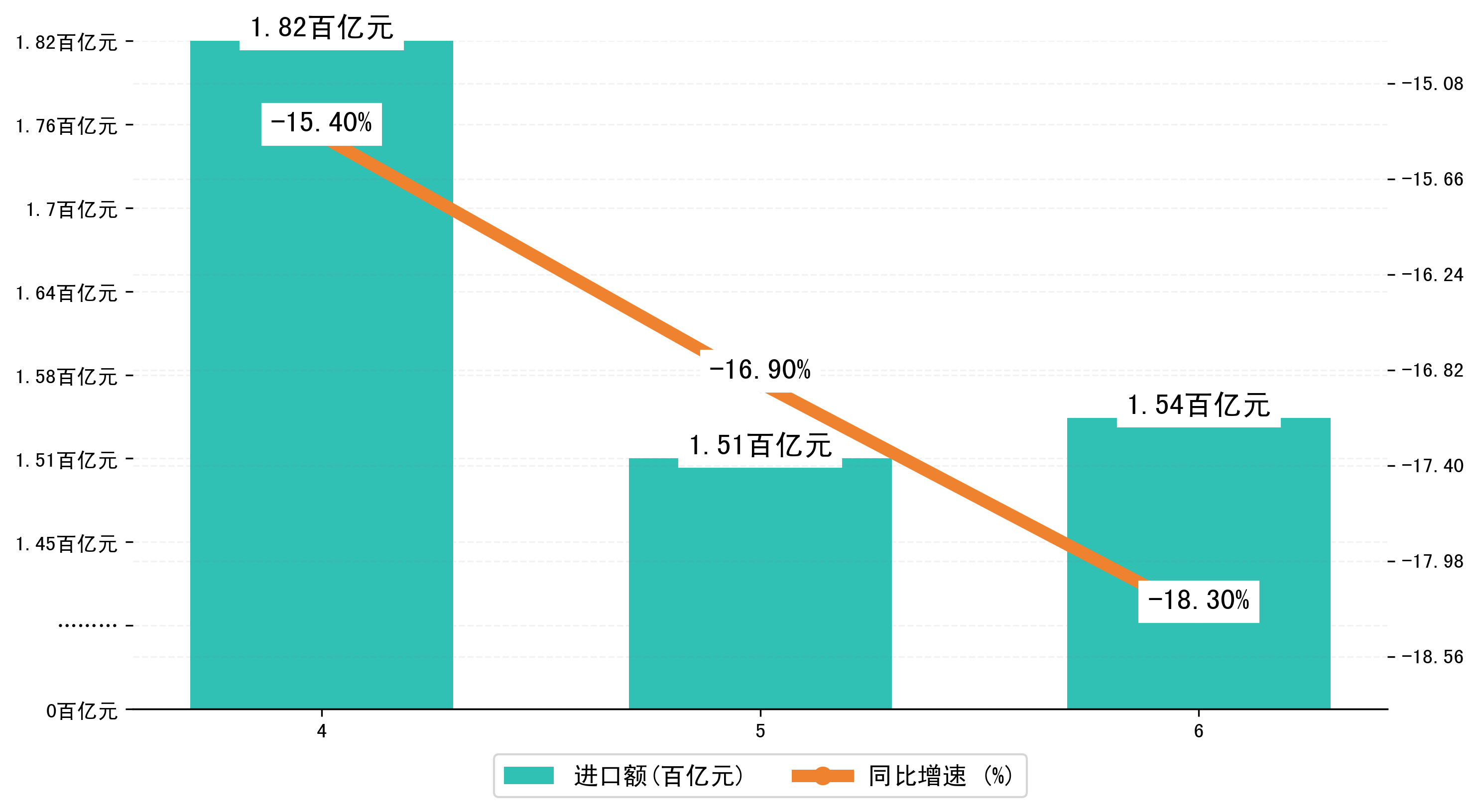 以人民币计,2024年6月南京市进口额为154,4459.9839万元,相比上月增加了2,9762.4877万元;相比上年同期减少了51,0991.2685万元,同比减少了-18.30%。