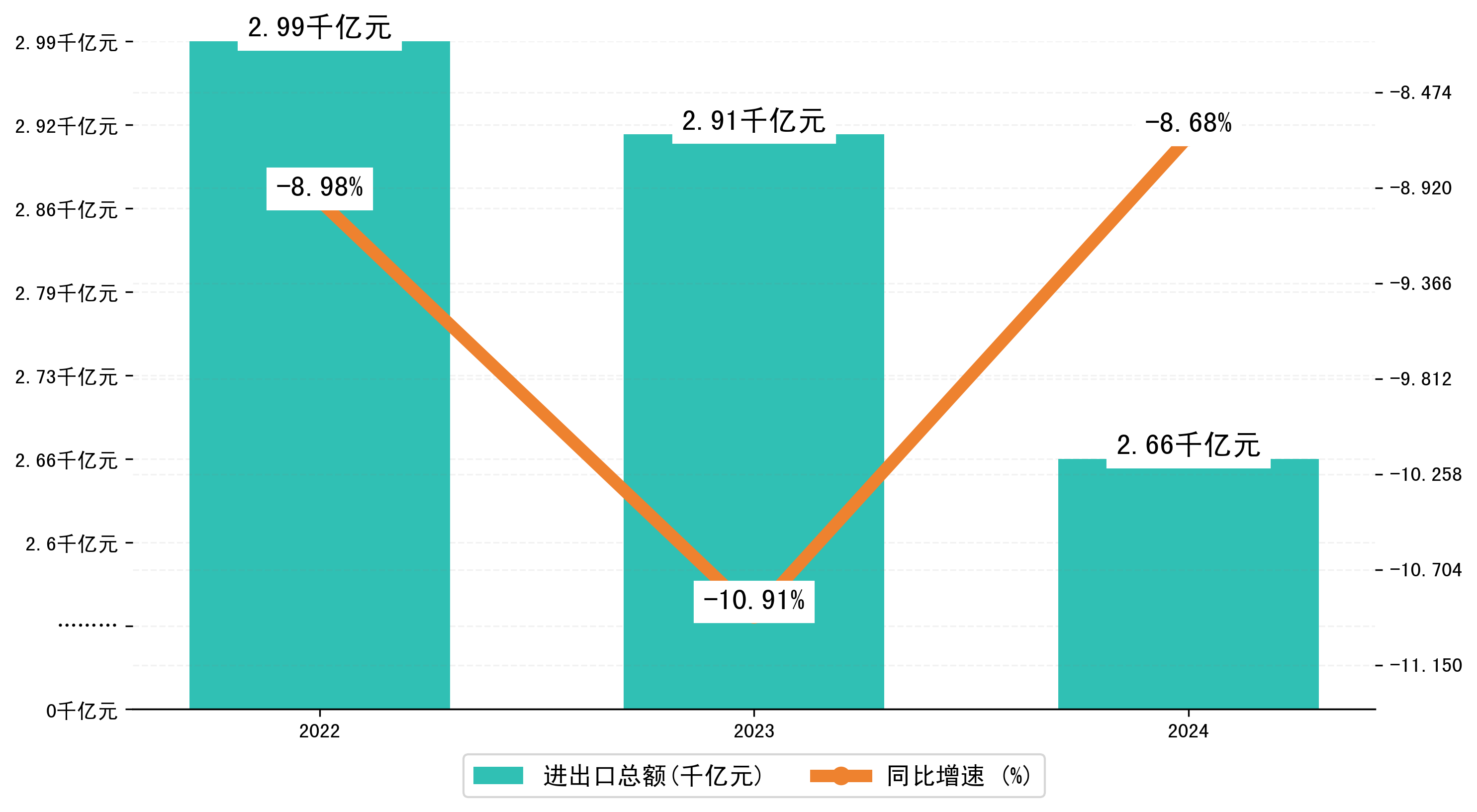 以人民币计,2024年1-6月南京市进出口总额为2661,7963.5372万元,相比上年同期减少了253,1419.7411万元,同比减少了-7.70%。