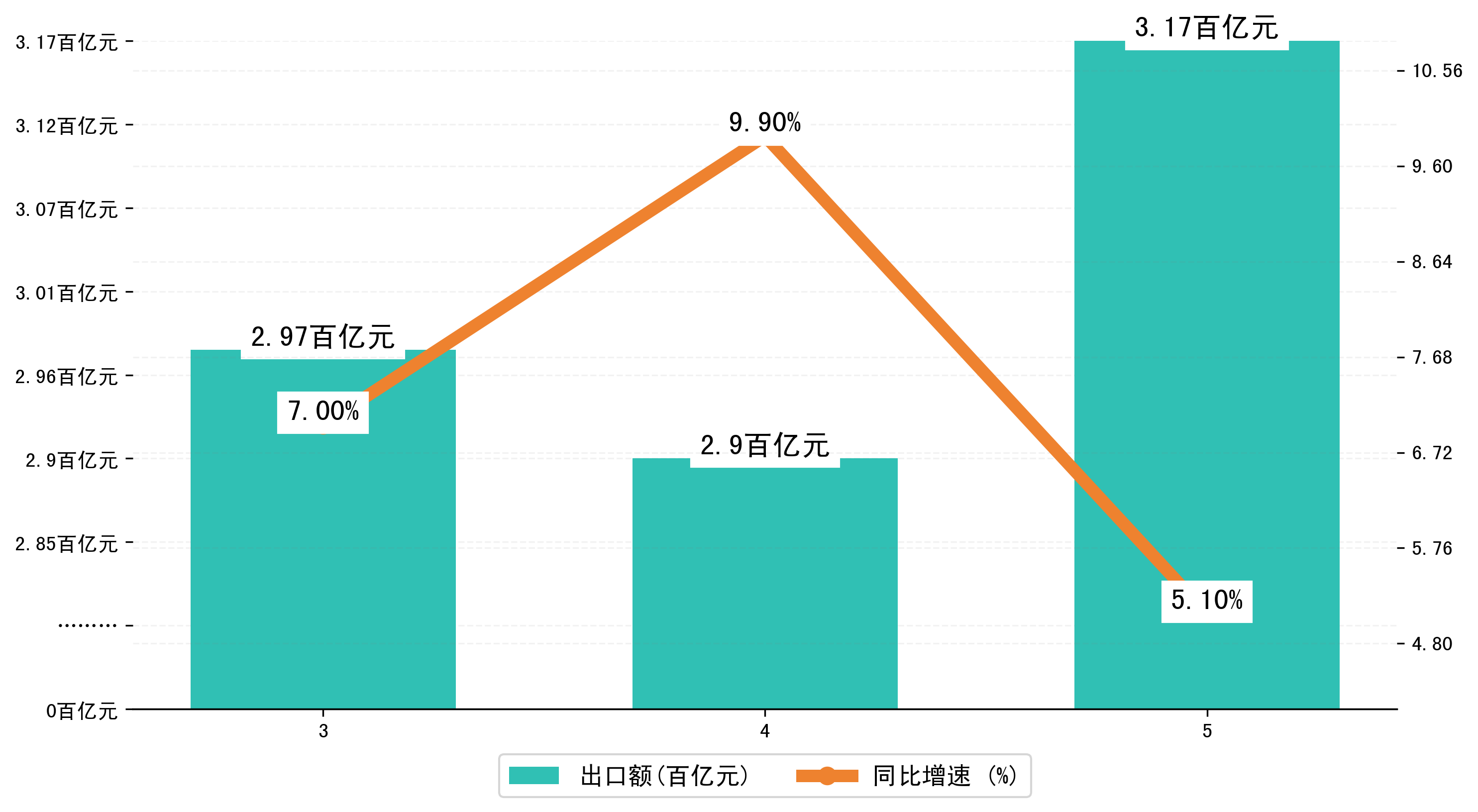 以人民币计,2023年5月南京市出口额为317,2767.4185万元,相比上月增加了26,7816.8496万元;相比上年同期减少了33,9649.4917万元,同比增加了5.10%。