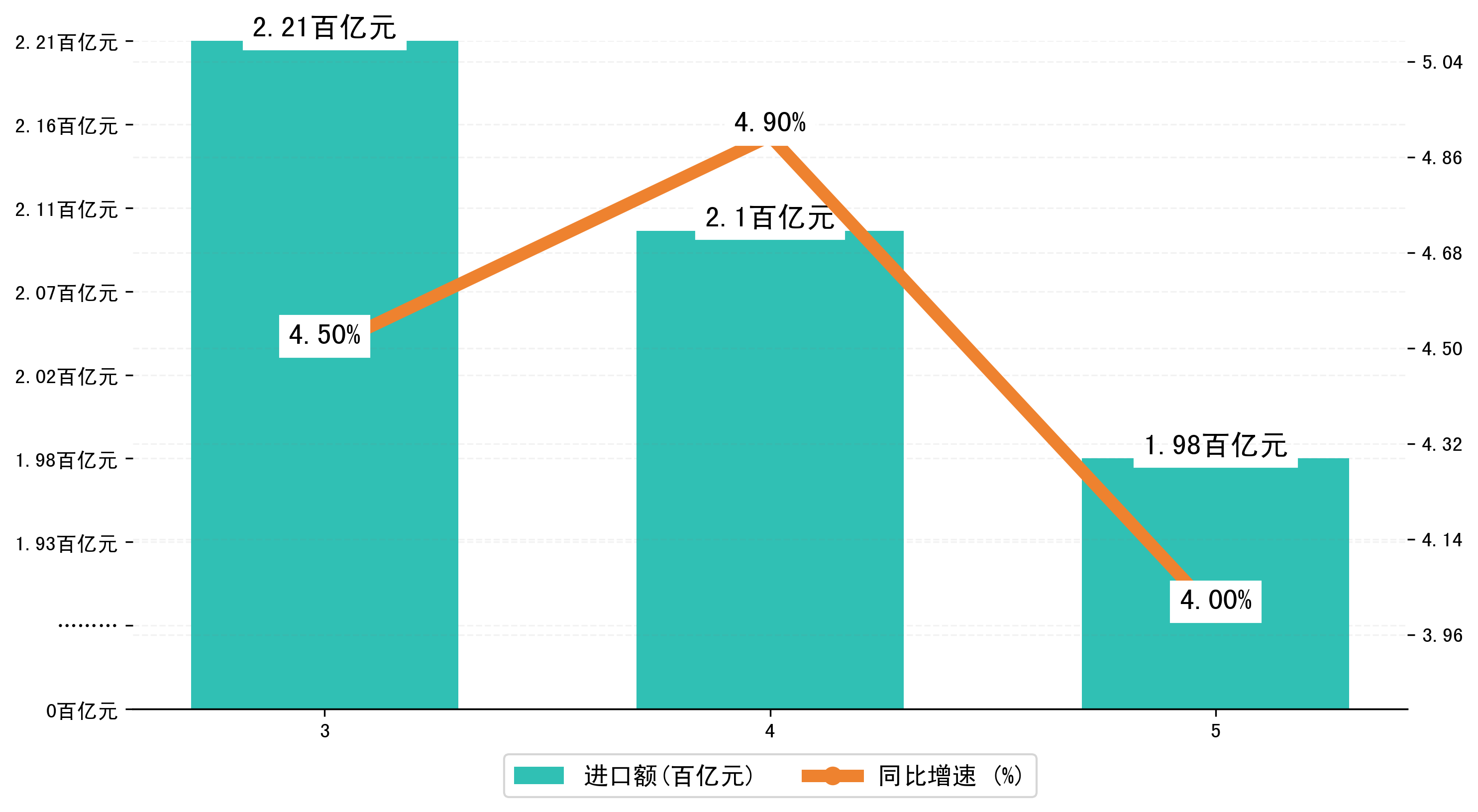 以人民币计,2023年5月南京市进口额为197,7092.6245万元,相比上月减少了12,5053.4287万元;相比上年同期增加了9025.3576万元,同比增加了4.00%。