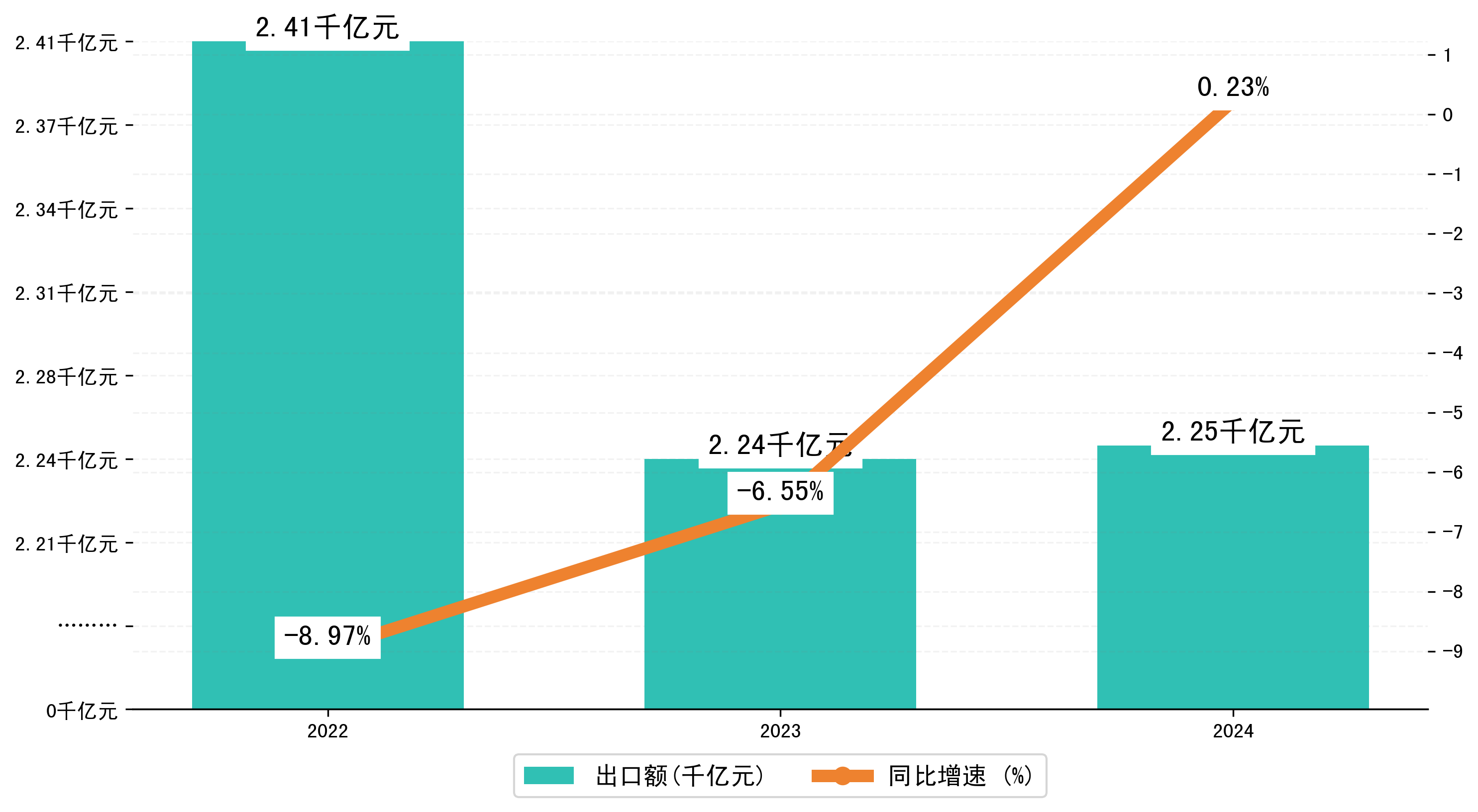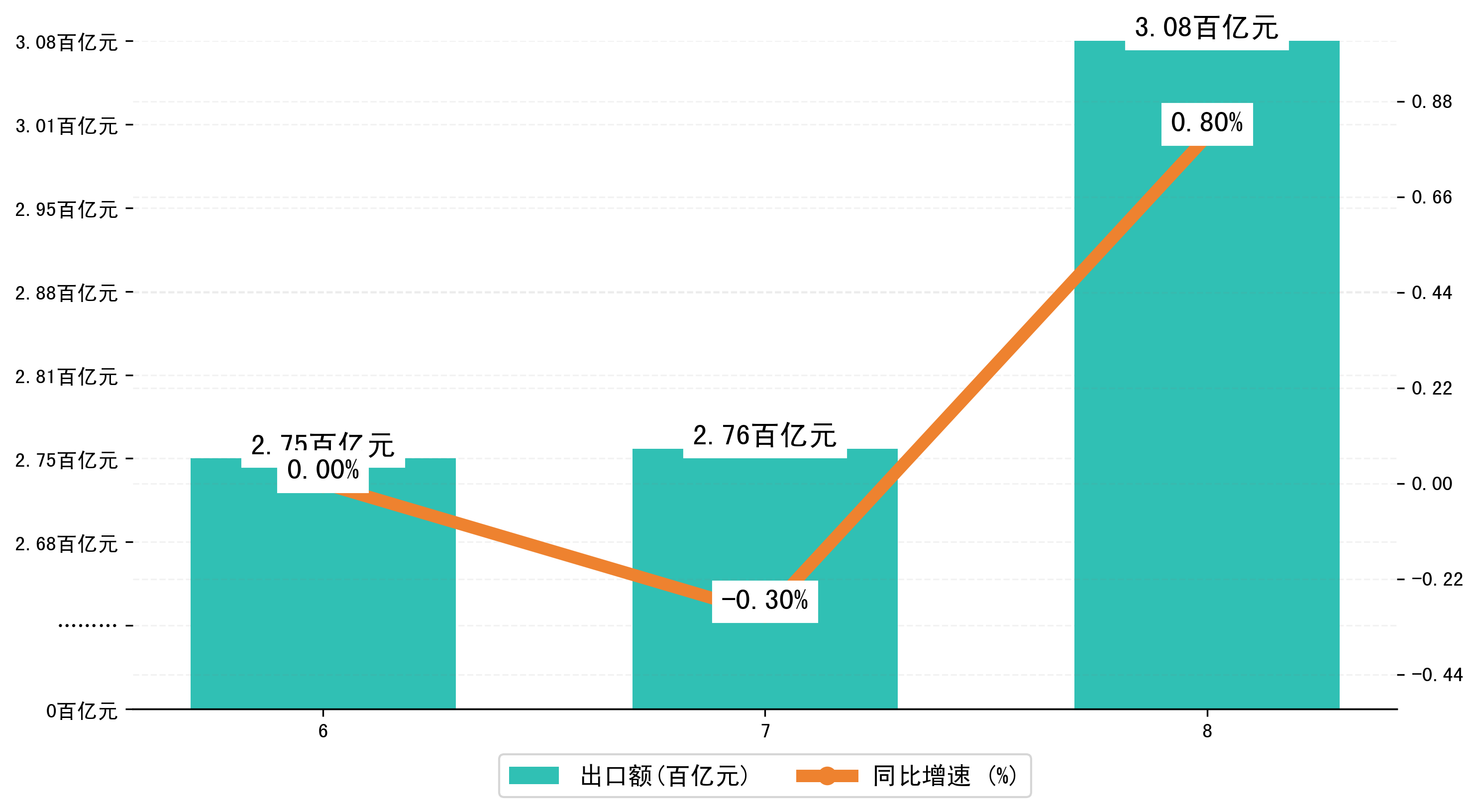 以人民币计,2024年1-8月南京市出口额为2248,2812.2978万元,相比上年同期增加了5,1658.502万元,同比增加了0.80%。