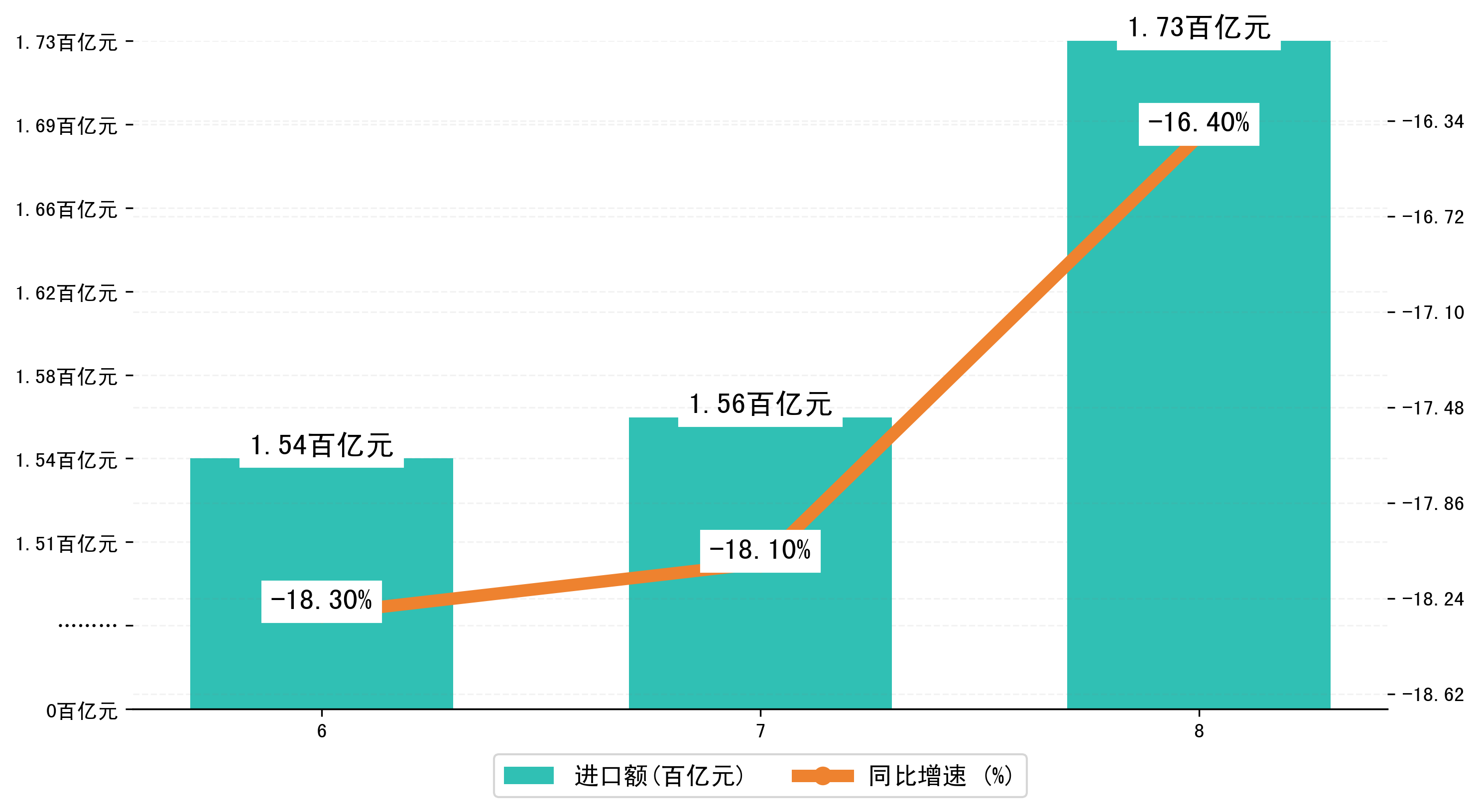以人民币计,2024年8月南京市进口额为173,0680.5569万元,相比上月增加了16,7870.3325万元;相比上年同期减少了4,3292.2724万元,同比减少了-16.40%。