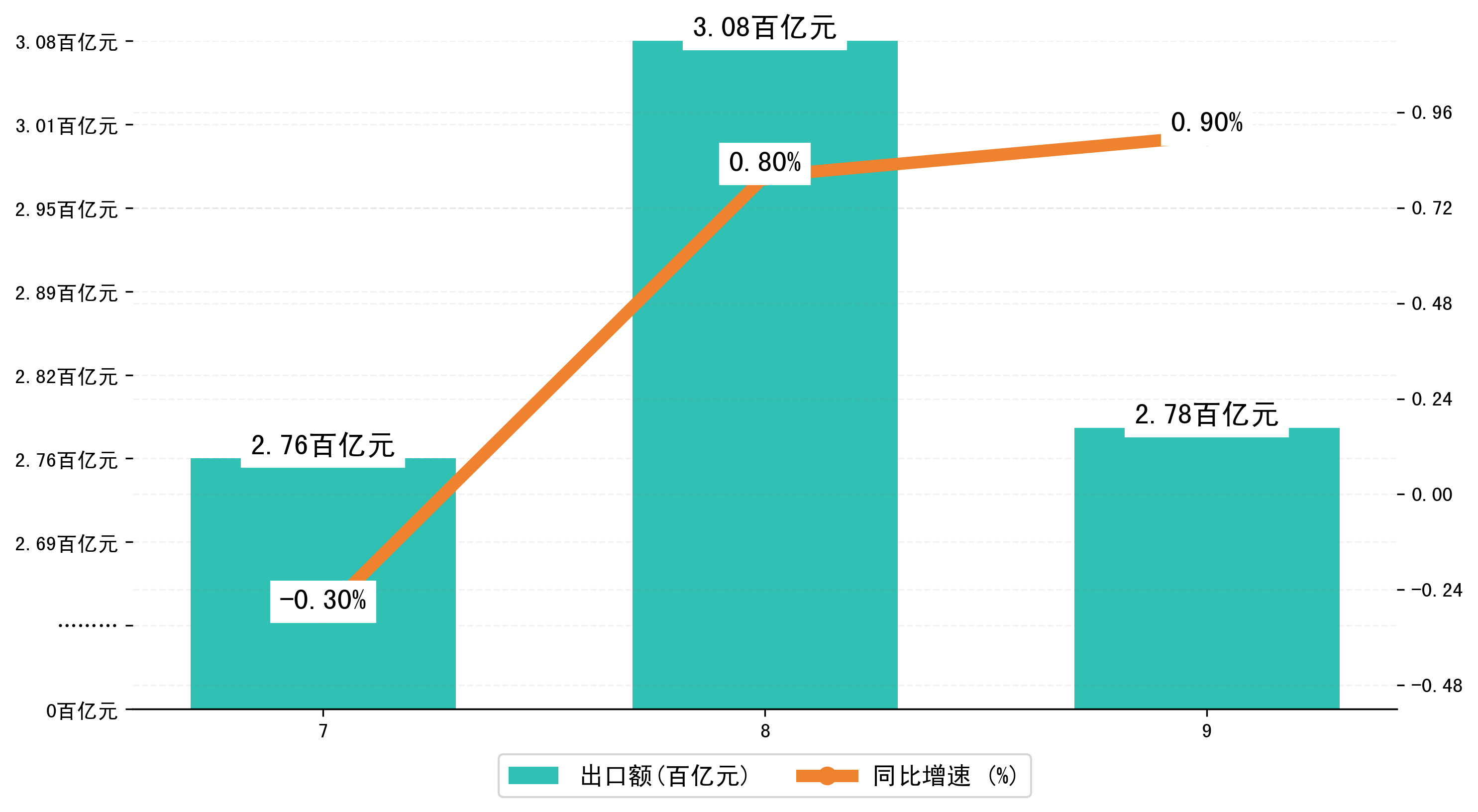 以人民币计,2024年9月南京市出口额为277,9356.2362万元,相比上月减少了30,0386.6046万元;相比上年同期增加了2,7432.5594万元,同比增加了0.90%。