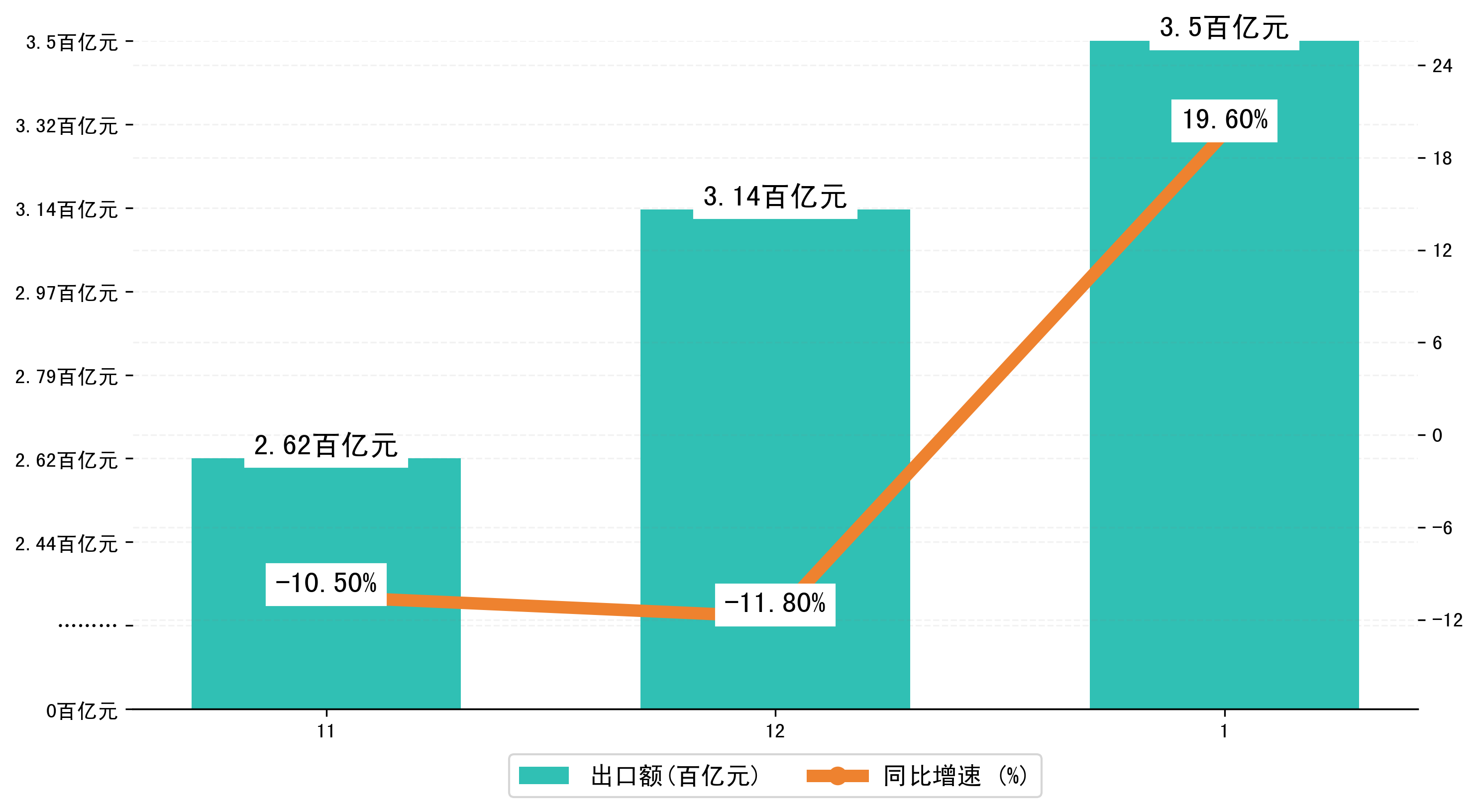 以人民币计,2024年1月南京市出口额为349,5408.393万元,相比上月增加了35,4900.2685万元;相比上年同期增加了42,6580.95万元,同比增加了19.60%。