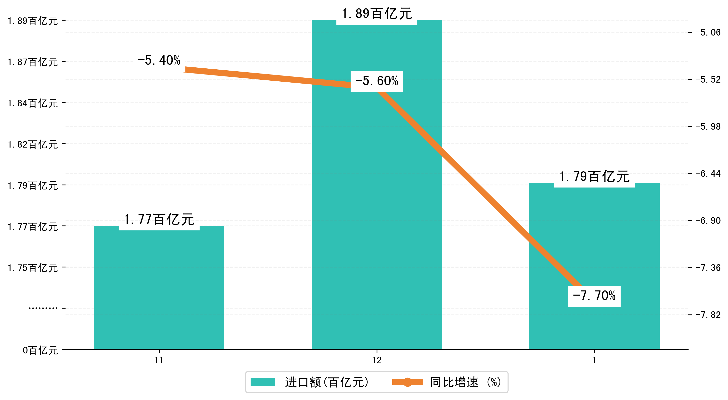 以人民币计,2024年1-1月南京市进口额为179,4881.7081万元,相比上年同期减少了14,9013.5044万元,同比减少了-7.70%。