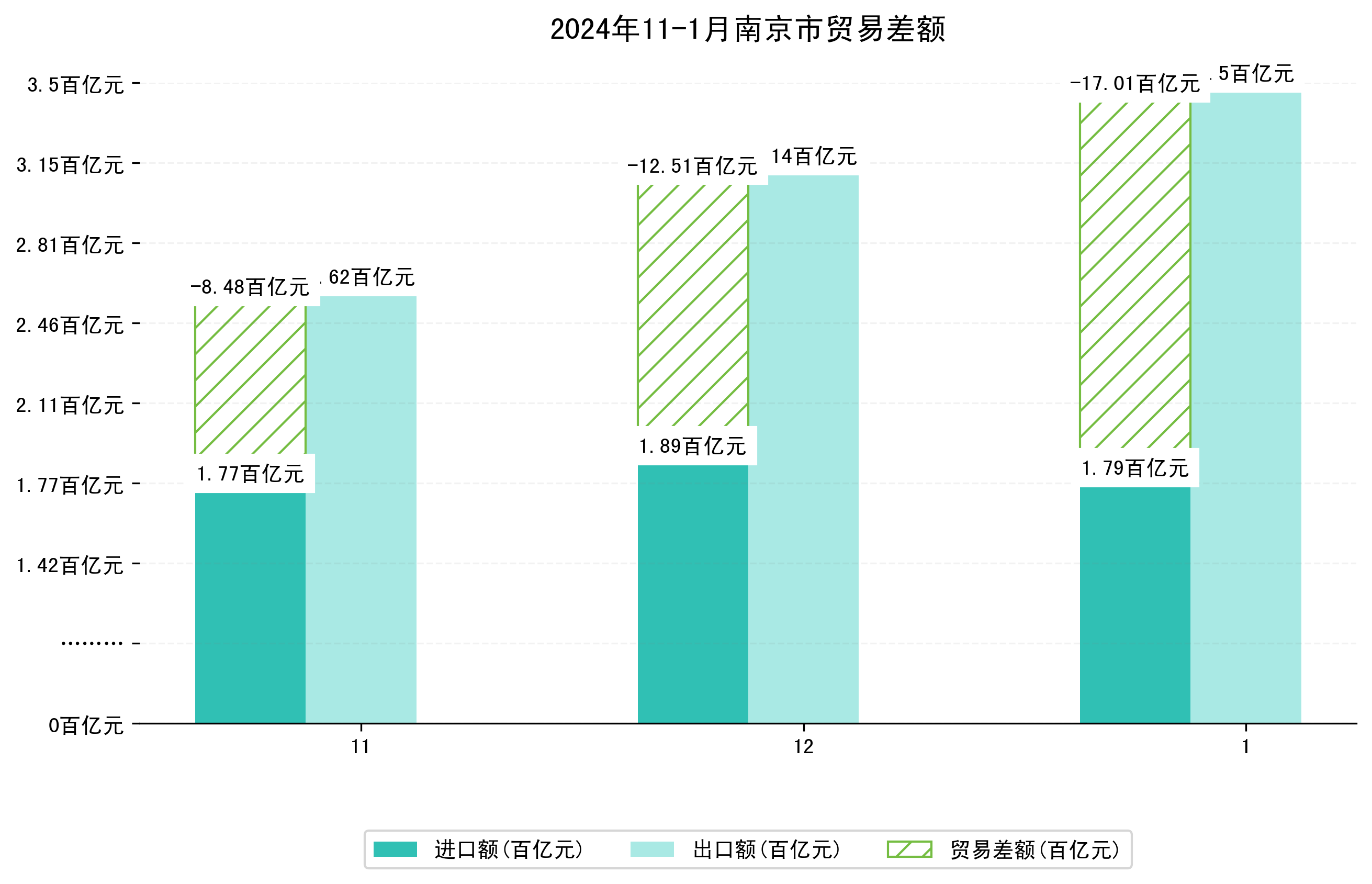 以人民币计,2024年1-1月南京市贸易差额为170,0526,6849万元(贸易顺差),相比上年同期增加了57,5594,4544万元,同比增加51.17%。