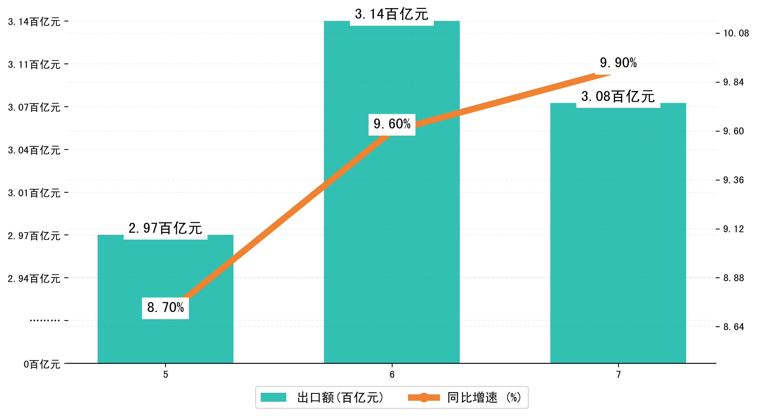 以人民币计,2025年7月南京市出口额为307,7528.7676万元,相比上月减少了6,5574.7242万元;相比上年同期增加了32,2037.1465万元,同比增加了9.90%。