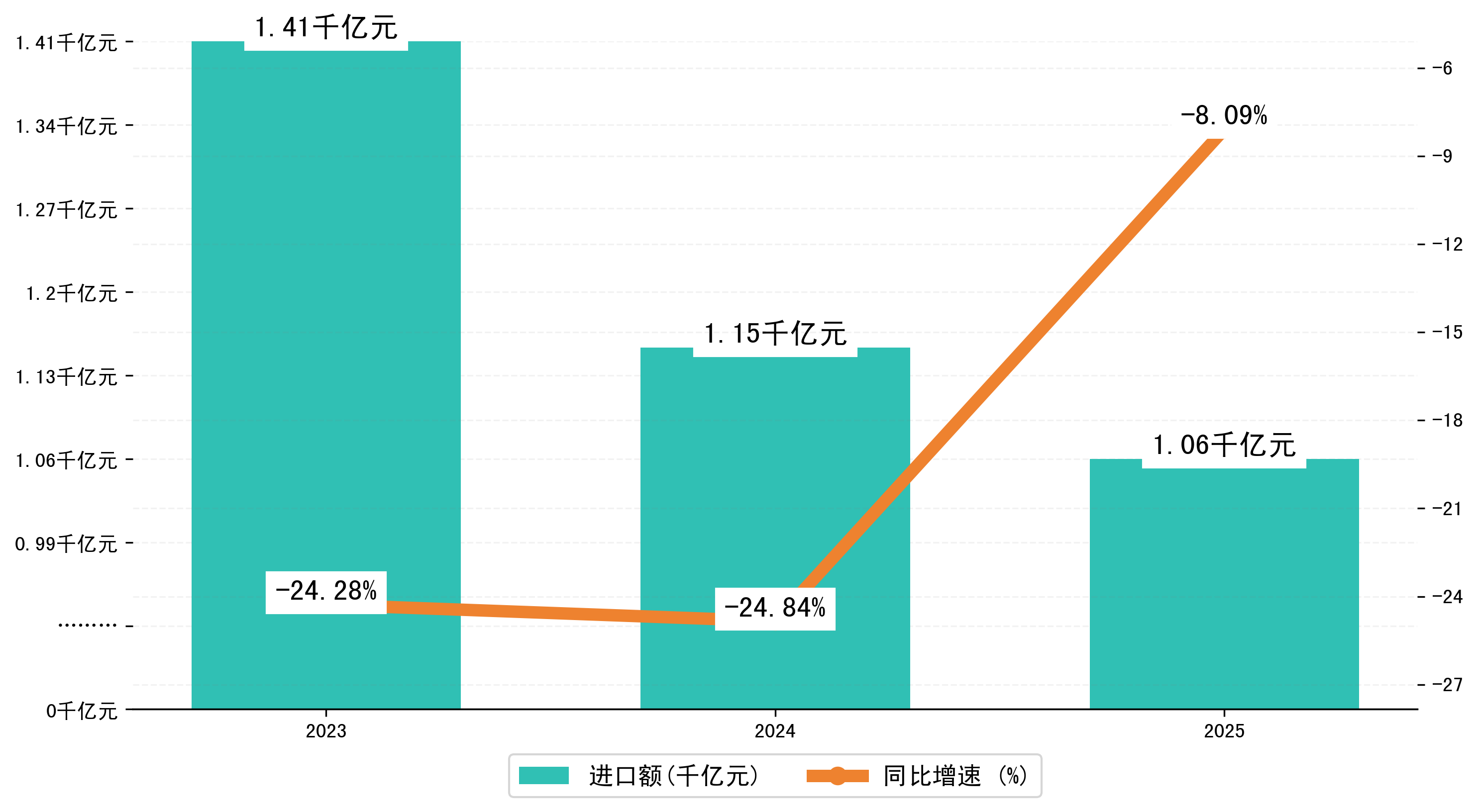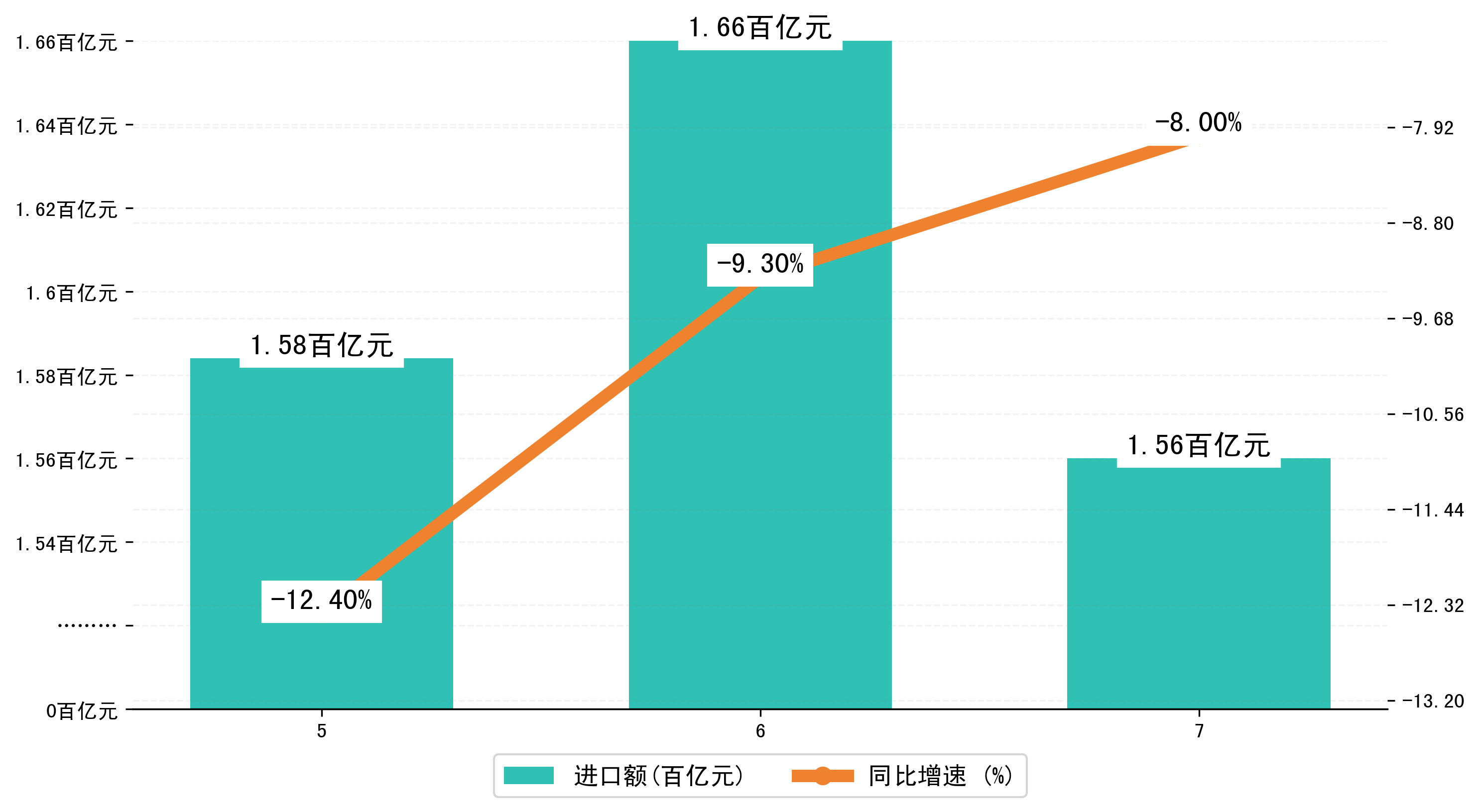 以美元计,2025年1-7月南京市进口额为147,5340.5829万美元,相比上年同期减少了14,6841.5281万美元,同比减少-9.00%。