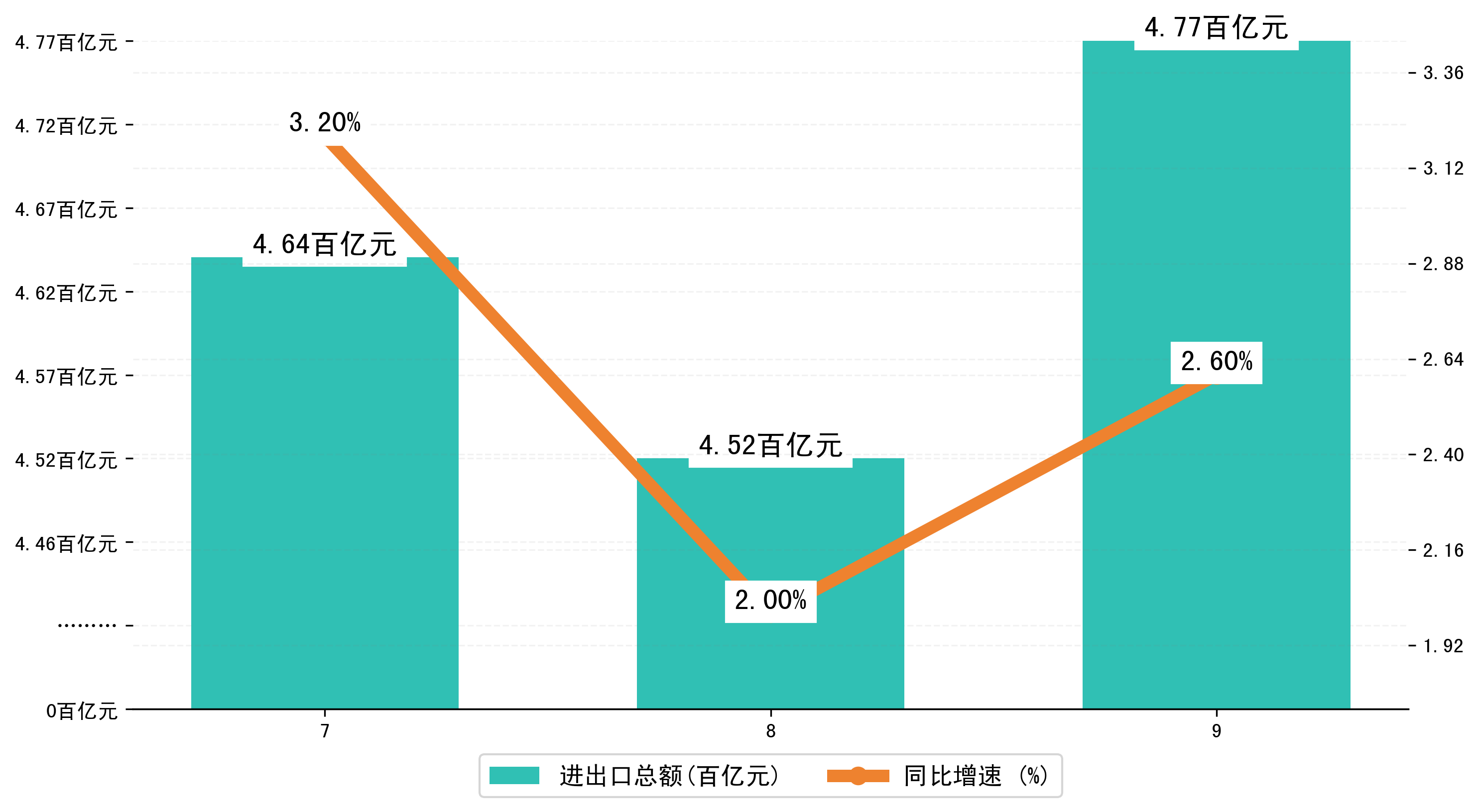以人民币计,2025年9月南京市进出口总额为476,9732.6672万元,相比上月增加了25,4659.8012万元;相比上年同期增加了32,0908.2204万元,同比增加了2.60%。