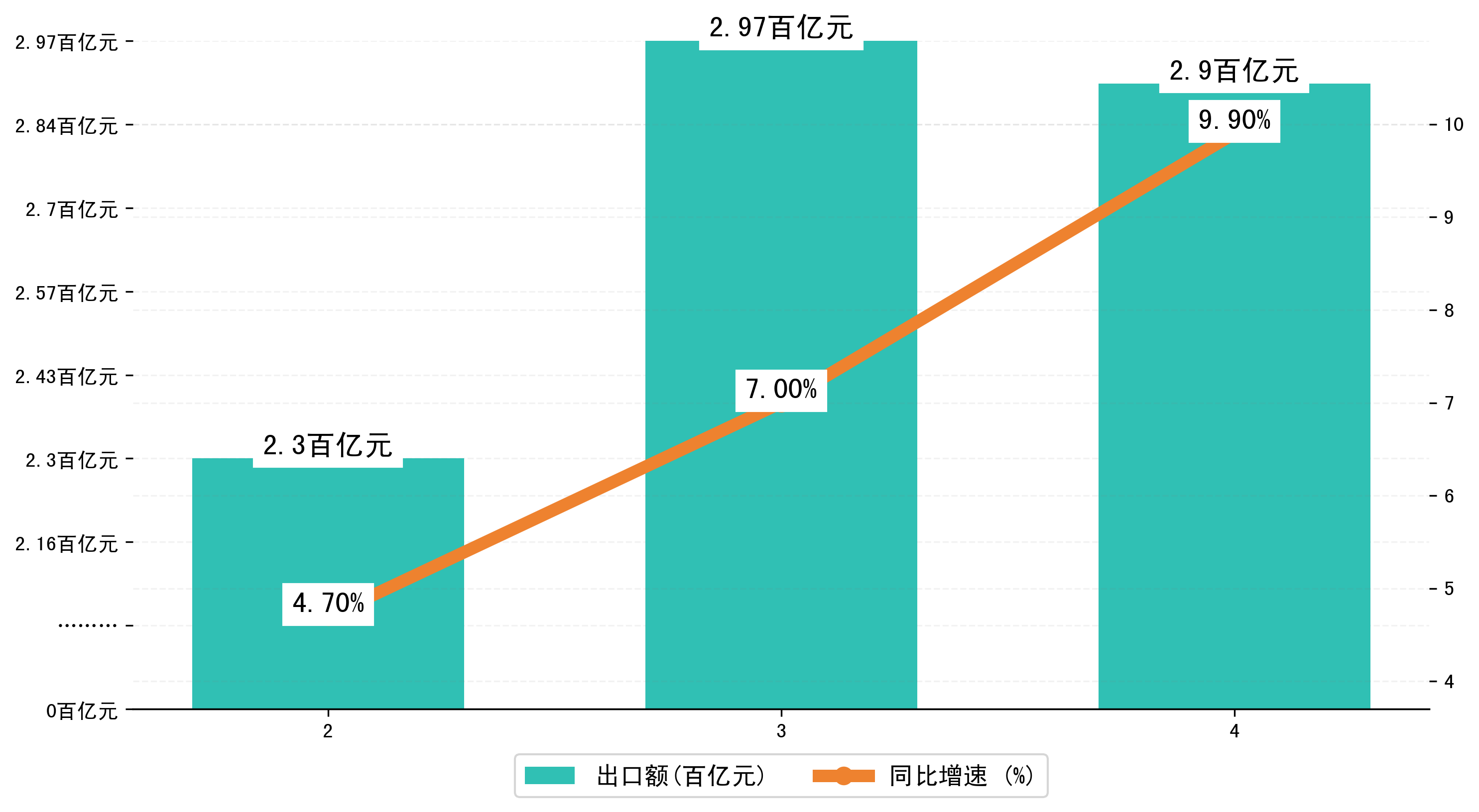 以人民币计,2023年1-4月南京市出口额为1124,7547.5045万元,相比上年同期增加了71,8775.6458万元,同比增加了9.90%。