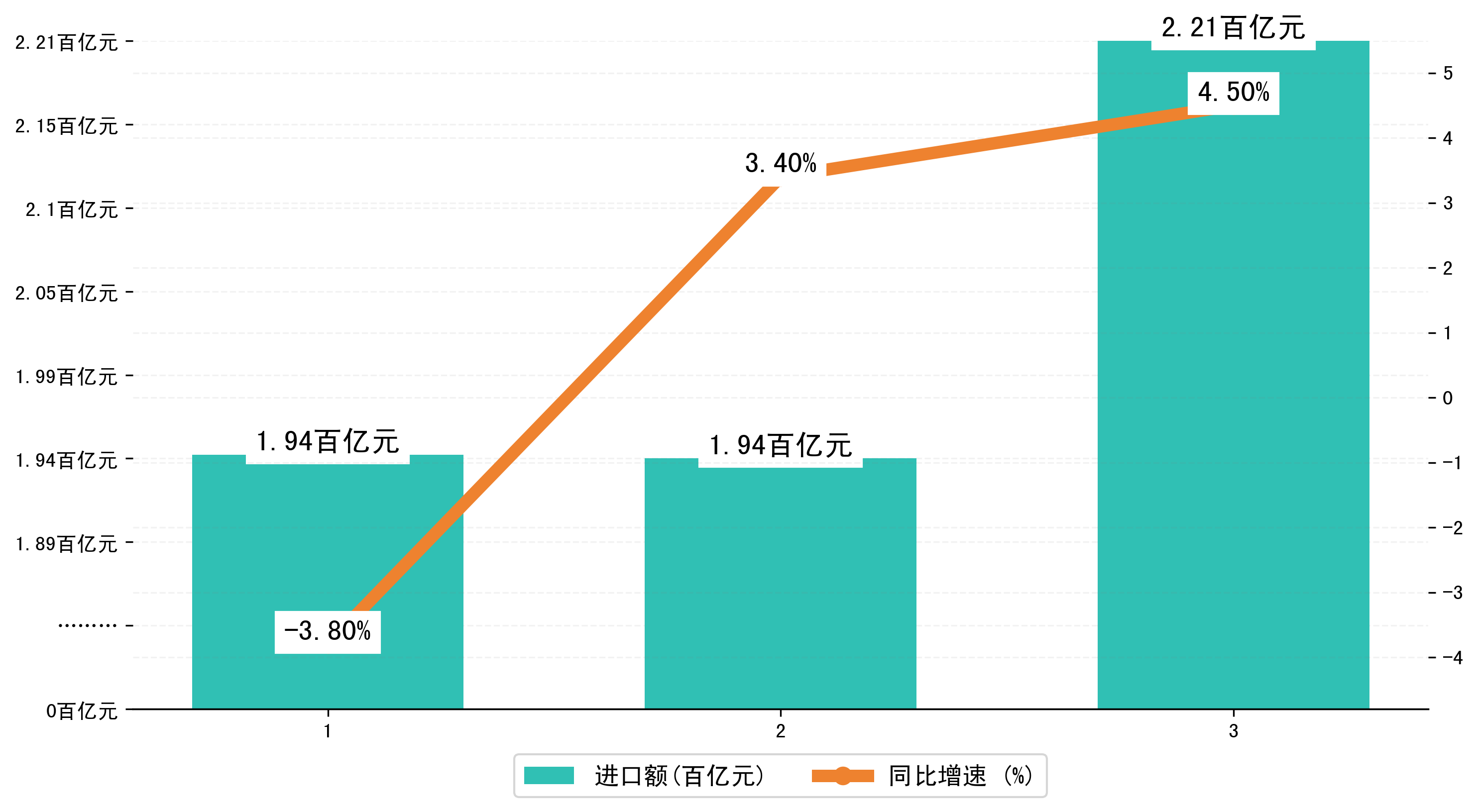 以人民币计,2023年3月南京市进口额为220,6432.2052万元,相比上月增加了26,4988.8966万元;相比上年同期增加了15,1746.269万元,同比增加了4.50%。