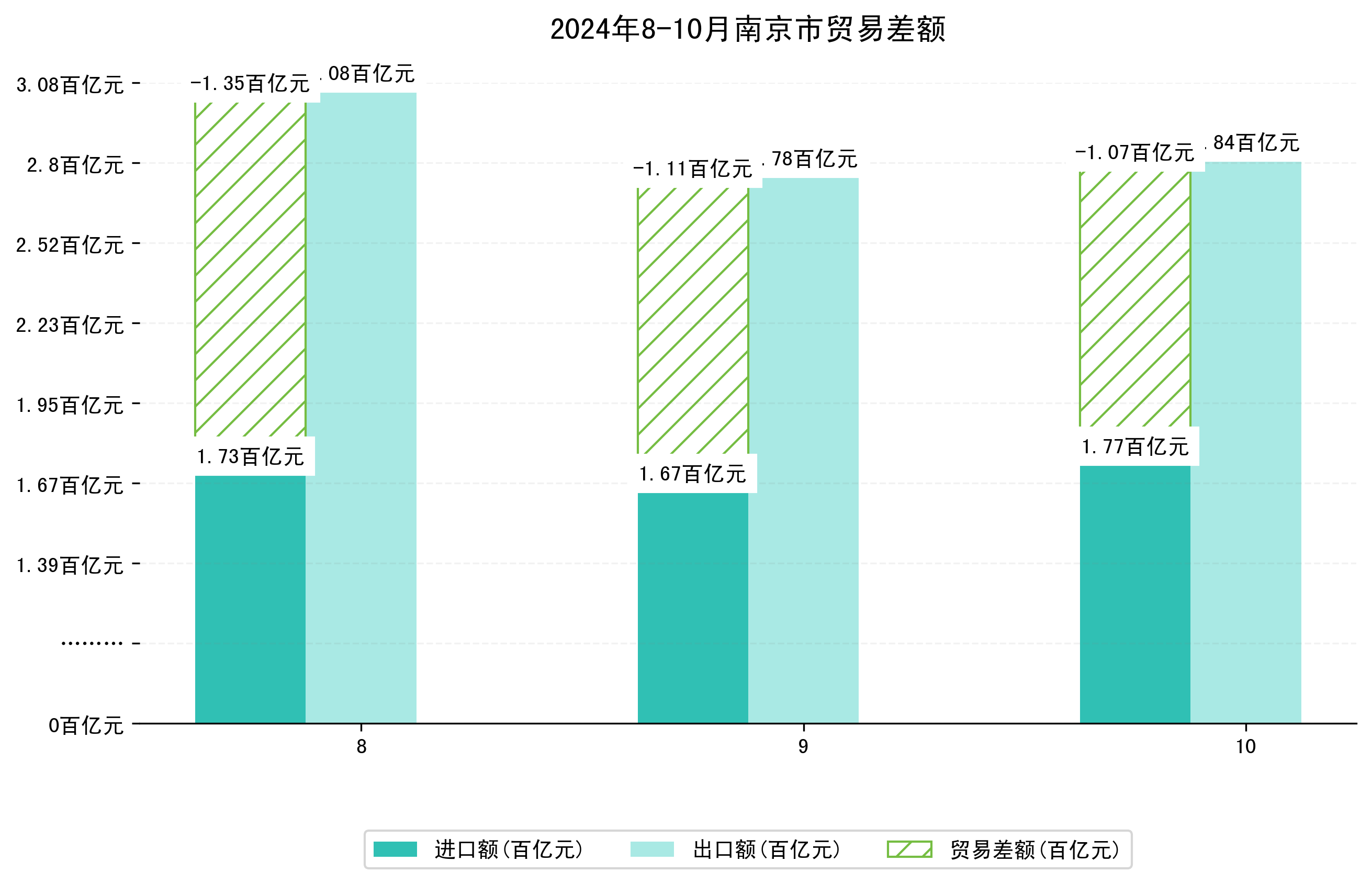 以人民币计,2024年10月南京市贸易差额为107,1991,2160万元(贸易顺差),相比上月减少了3,7896,8096万元,即4542,9612万美元;相比上年同期增加了38,0587,2385万元,同比增加55.05%。
