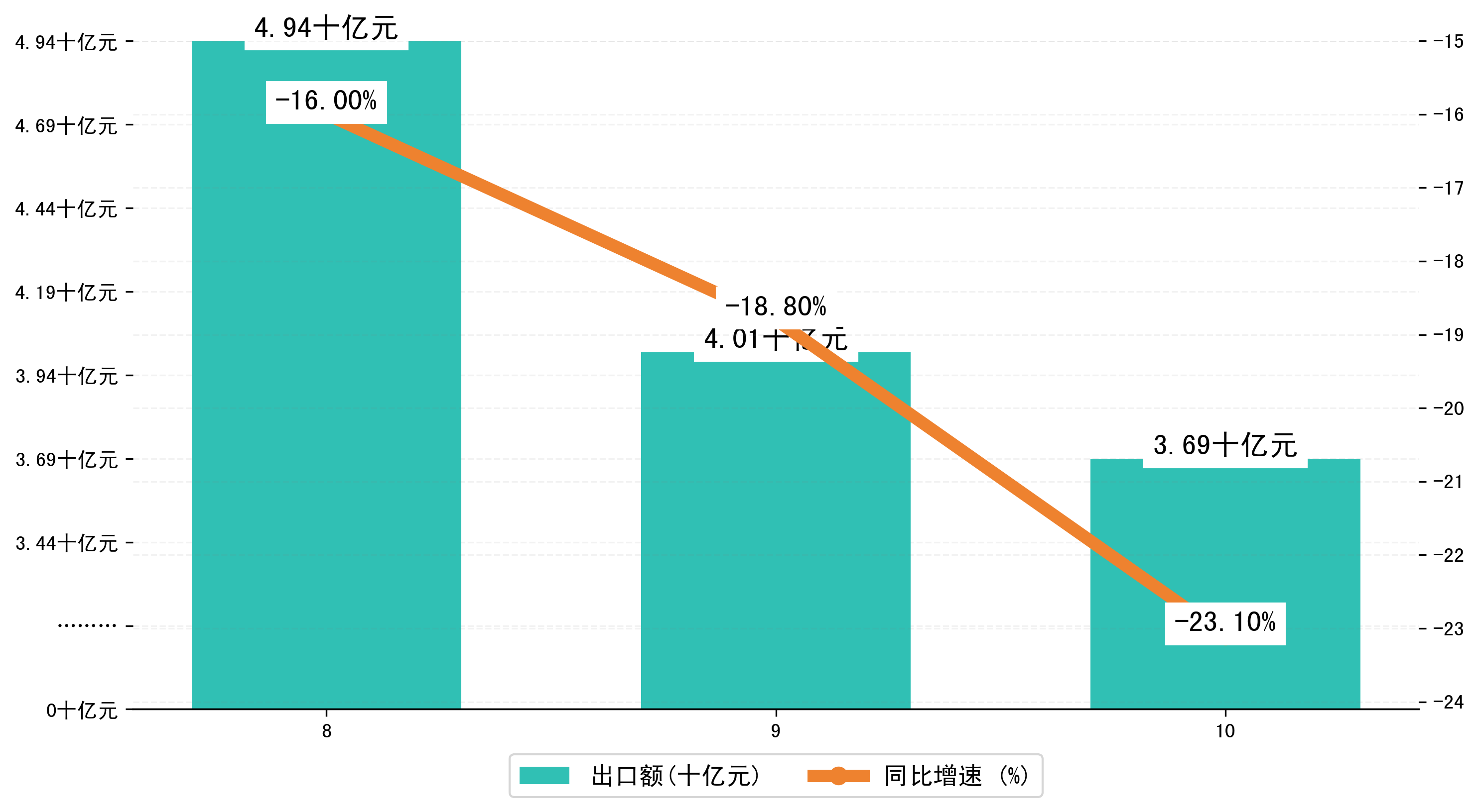 以美元计,2024年1-10月南宁市出口额为49,2013.6026万美元,相比上年同期减少了19,0825.3562万美元,同比减少-24.00%。