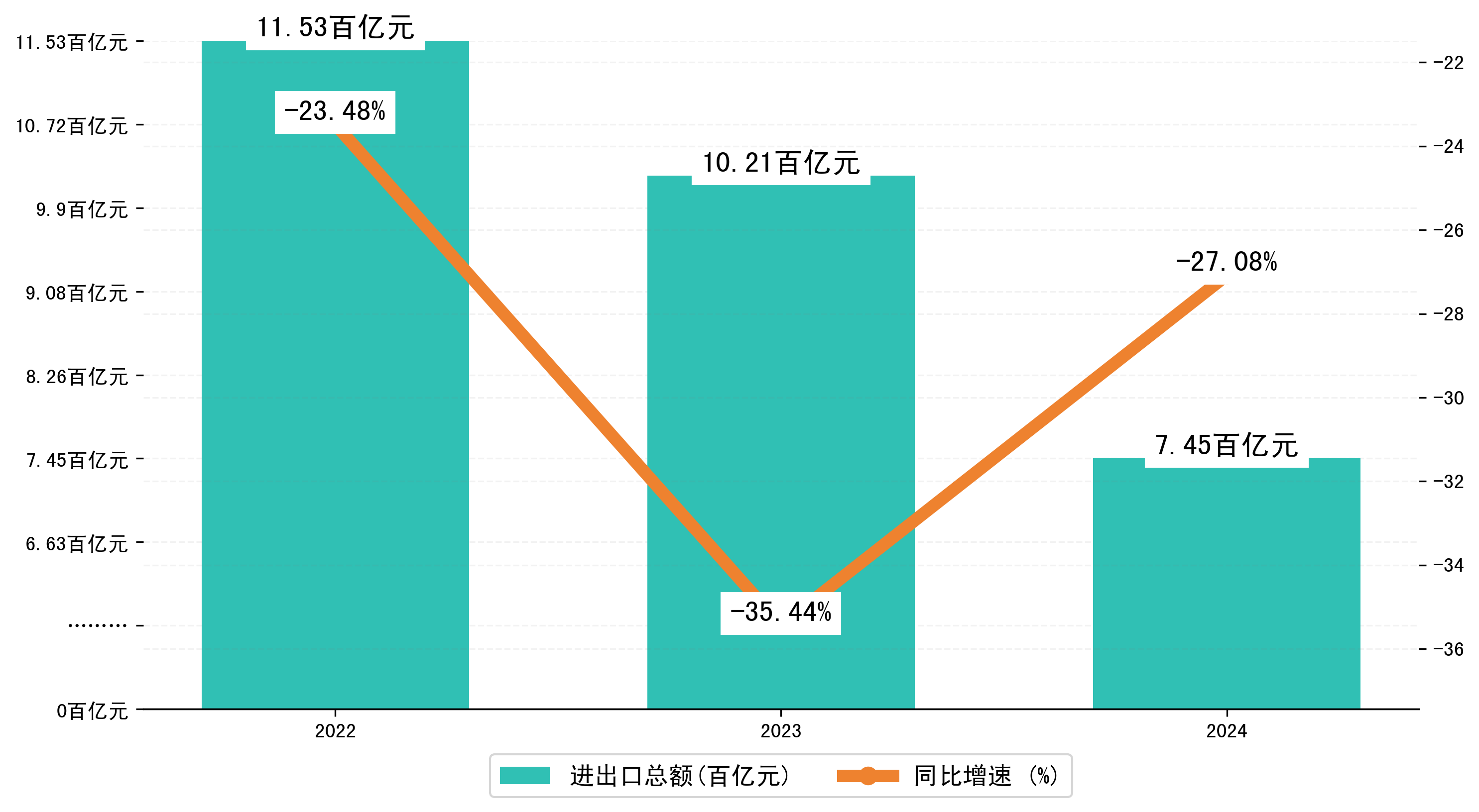 以人民币计,2024年1-10月南宁市进出口总额为744,6200.1658万元,相比上年同期减少了276,5954.6161万元,同比减少了-21.50%。