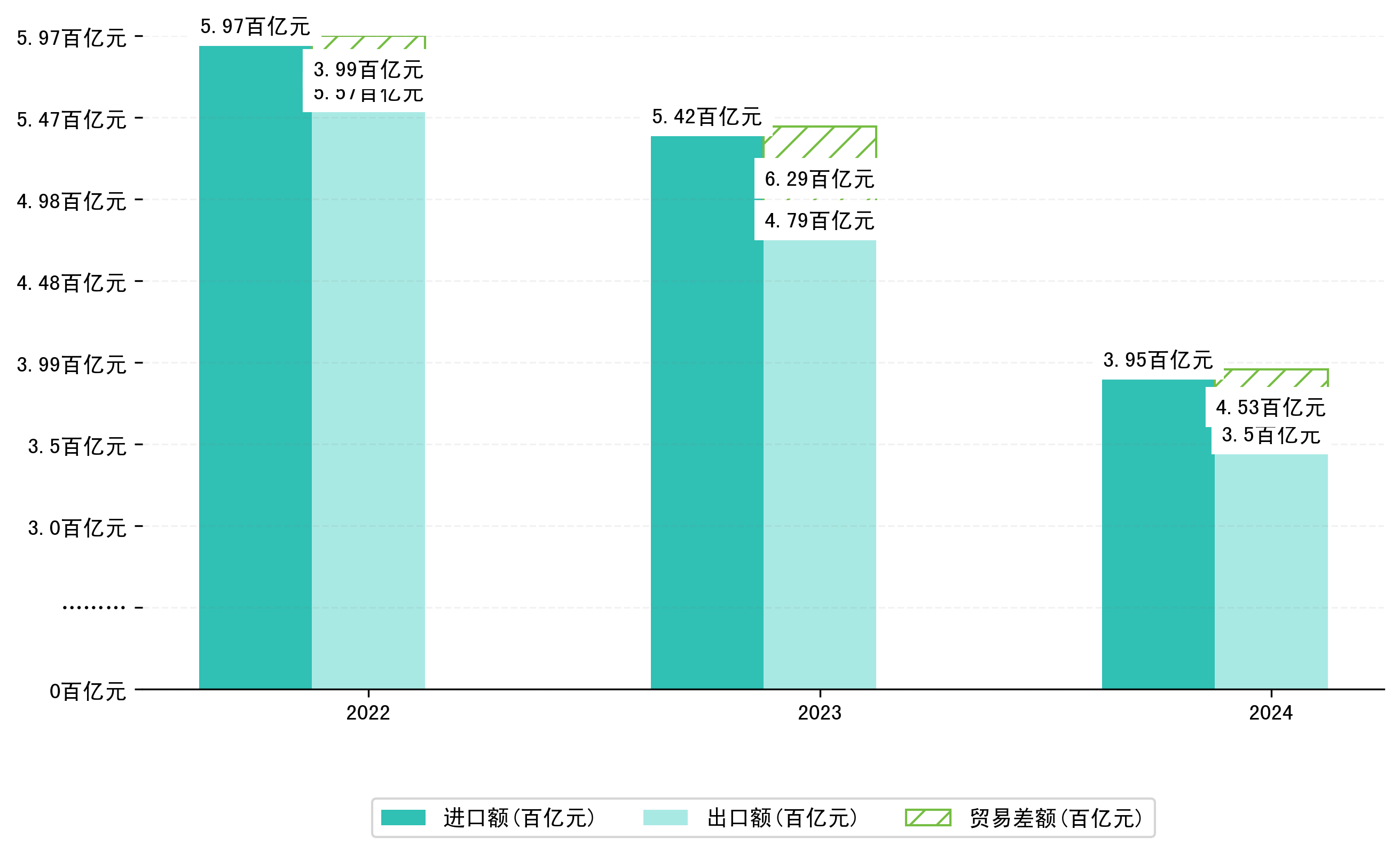 以美元计,2024年1-10月南宁市贸易差额为6,3420,6362万美元(贸易逆差),相比上年同期增加了2,9525,1142万美元,同比增加-31.77%。