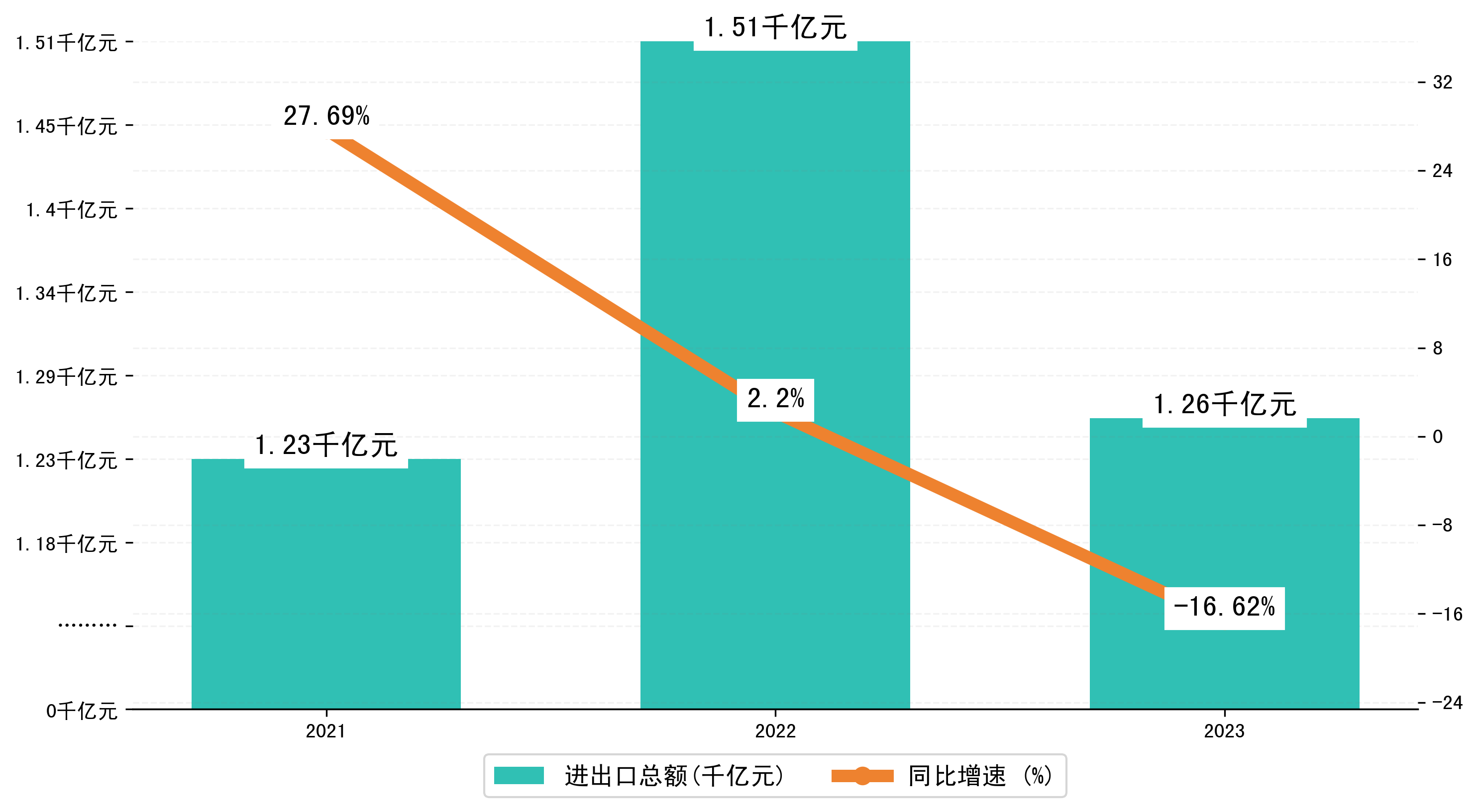 以人民币计,2023年1-12月南宁市进出口总额为1259,0643.3191万元,相比上年同期减少了251,0093.6714万元,同比减少了-14.70%。