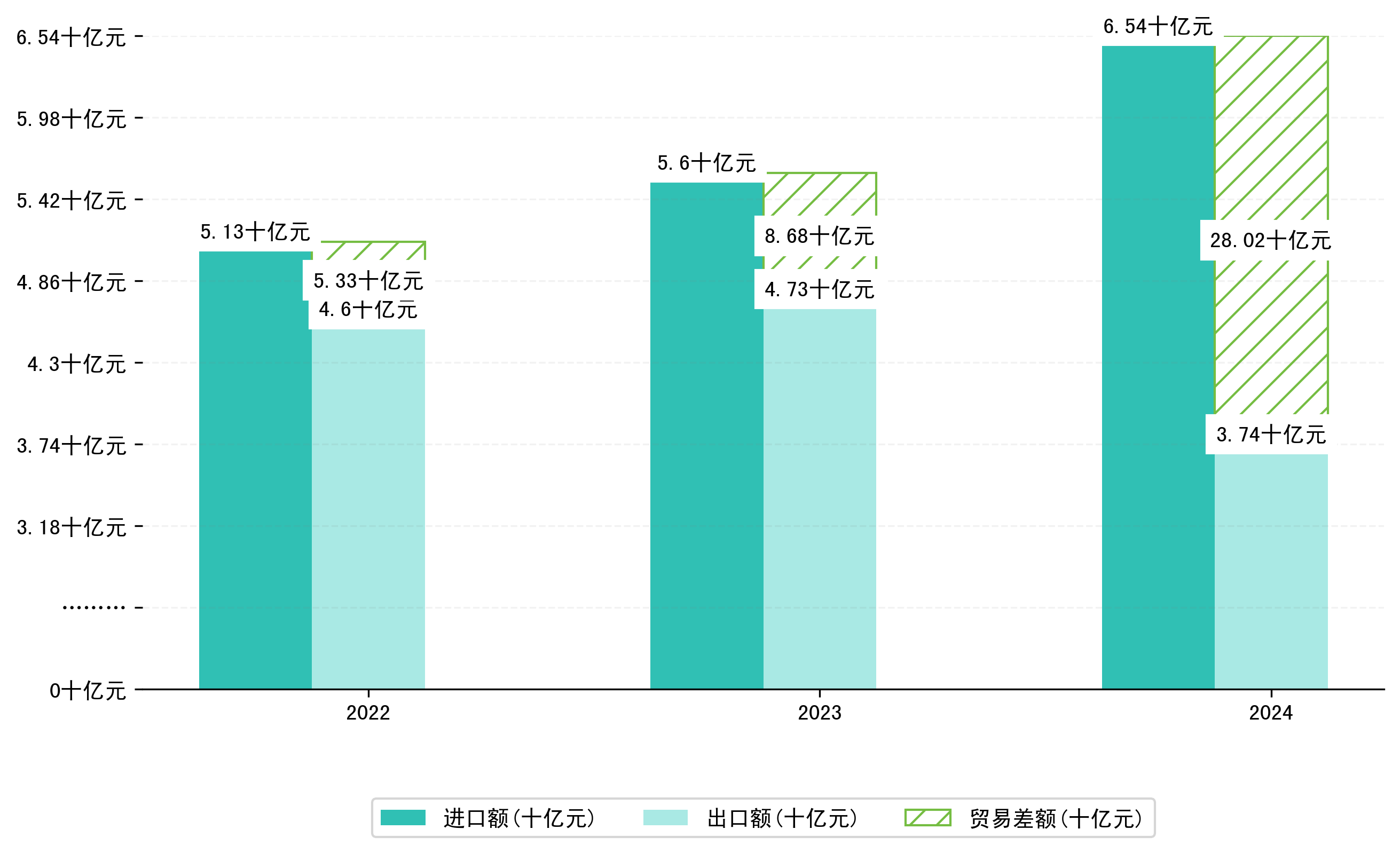 以人民币计,2024年1月南宁市贸易差额为28,0216,0009万元(贸易逆差),相比上月减少了26,2306,7966万元,即3,6898,9204万美元;相比上年同期减少了19,3448,5533万元,同比减少222.95%。