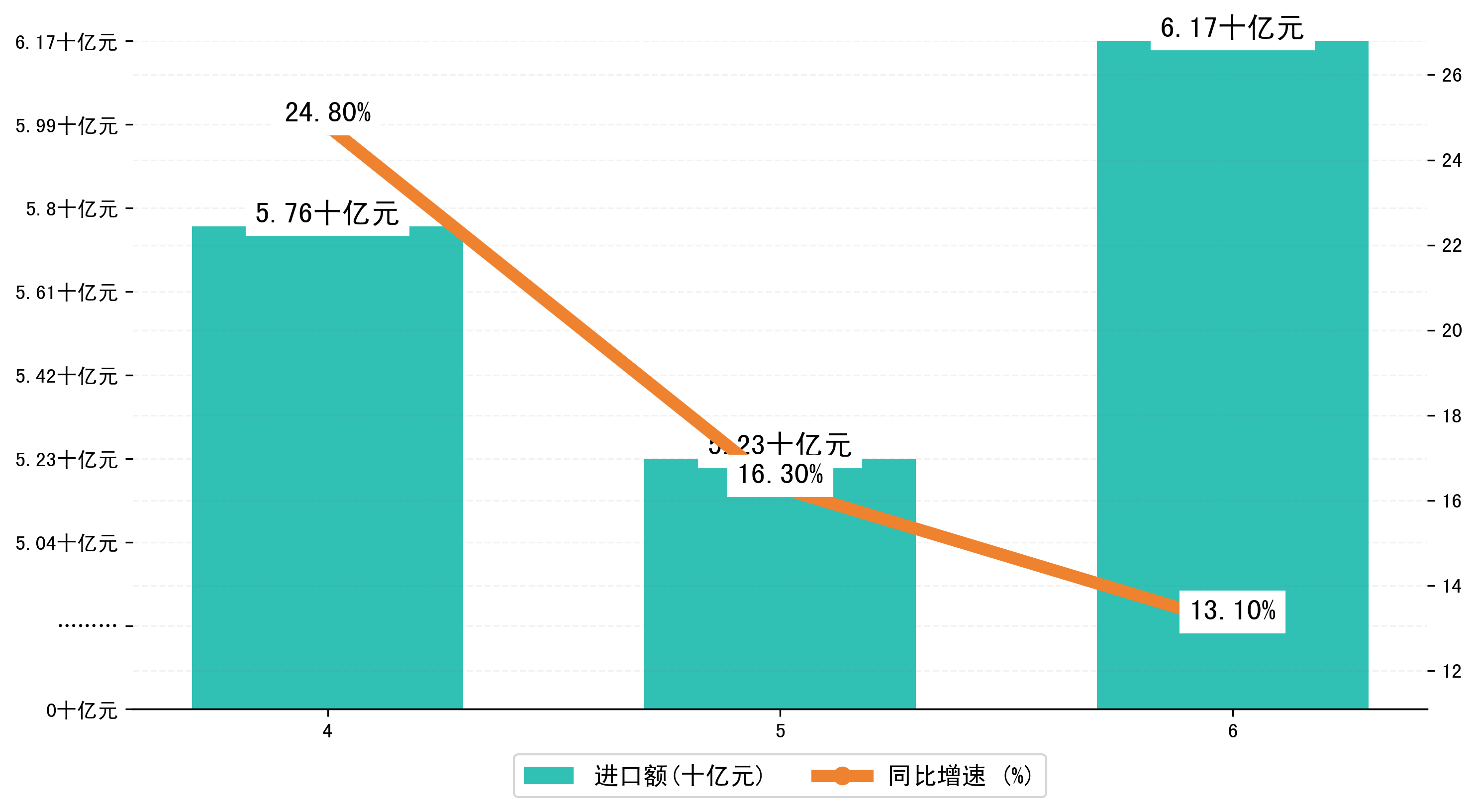 以人民币计,2023年6月南宁市进口额为61,7401.4748万元,相比上月增加了9,4188.1707万元;相比上年同期减少了1,8196.7778万元,同比增加了13.10%。
