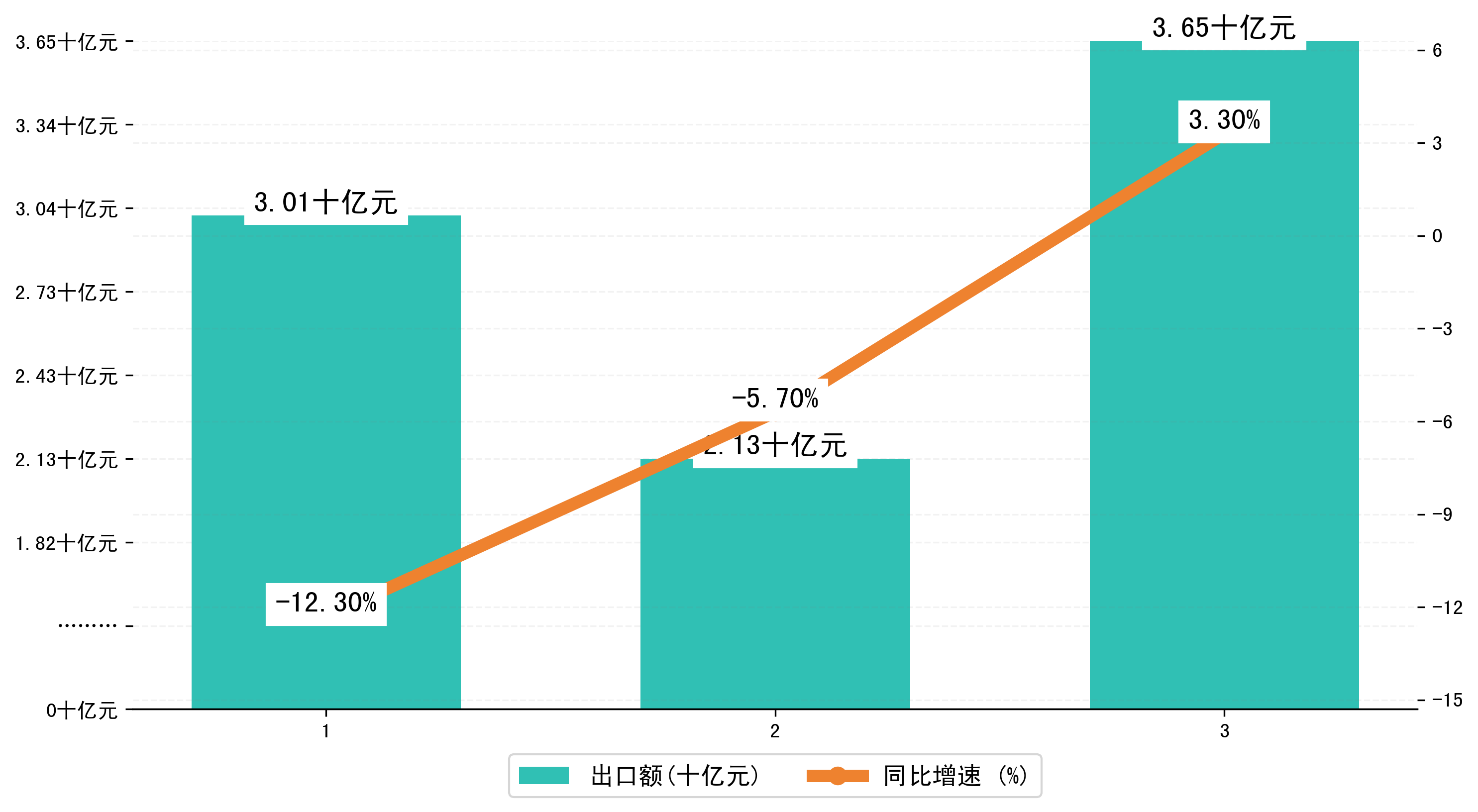 以美元计,2025年1-3月南宁市出口额为12,2348.0545万美元,相比上年同期增加了1086.5484万美元,同比增加2.30%。