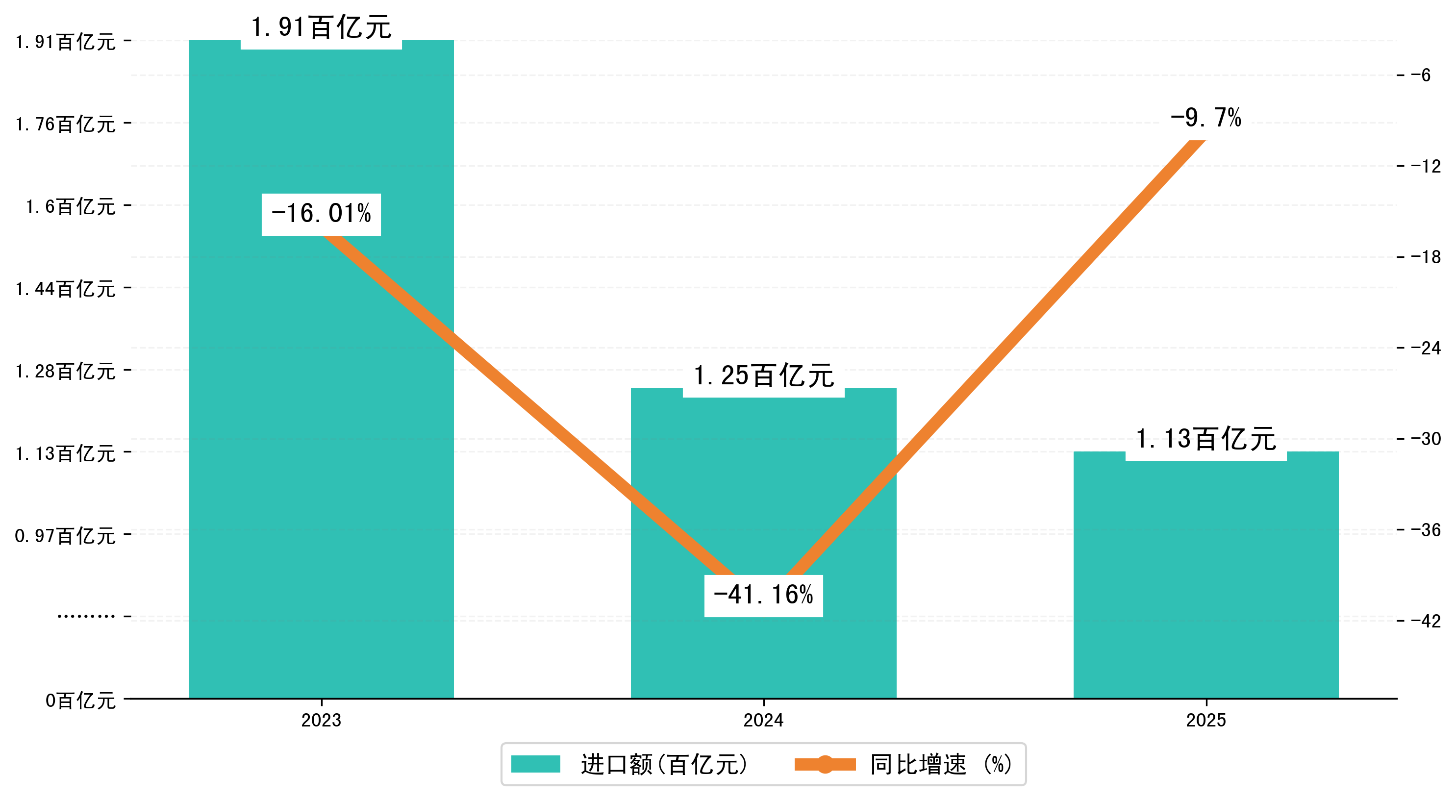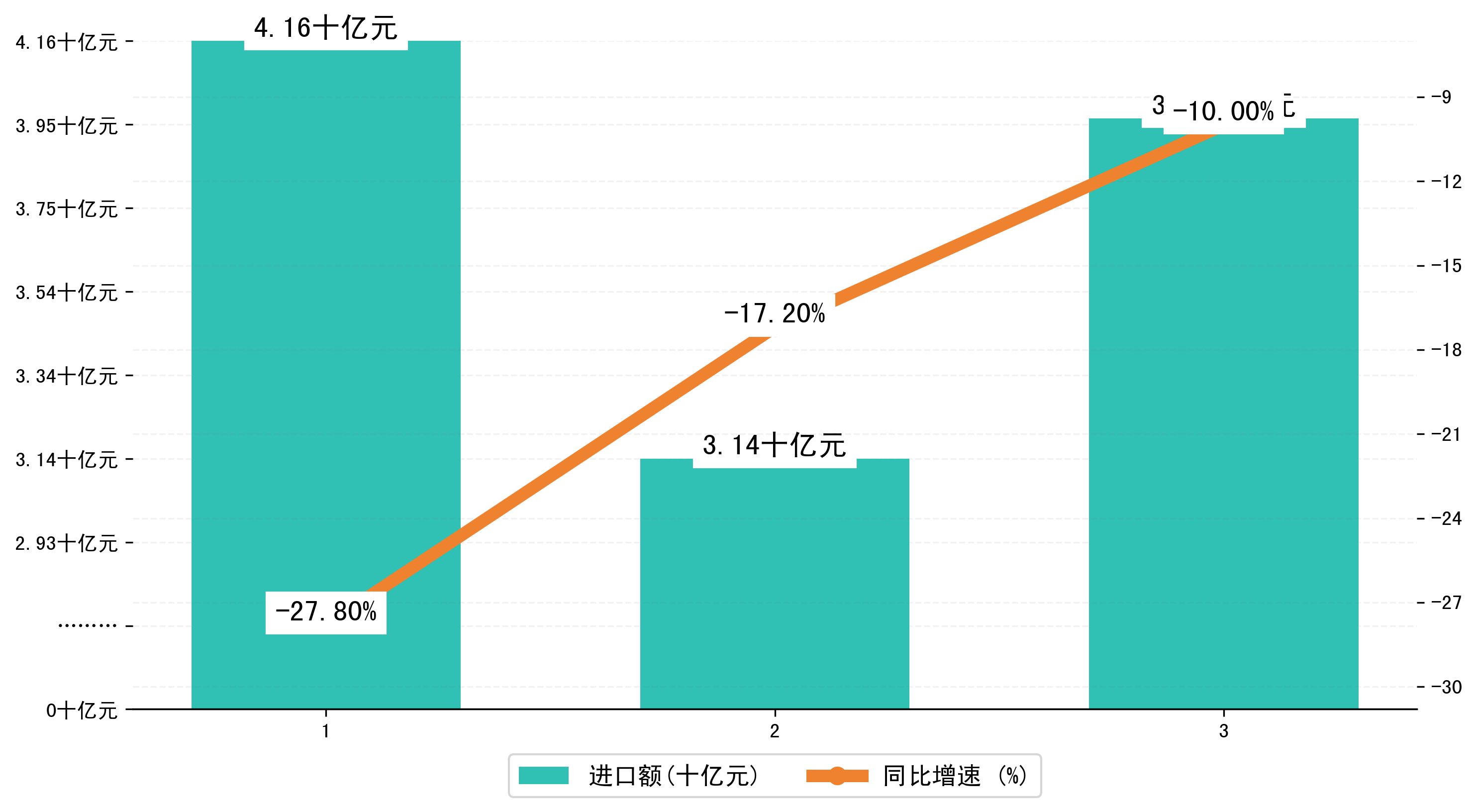 以人民币计,2025年1-3月南宁市进口额为112,6249.328万元,相比上年同期减少了12,1005.5817万元,同比减少了-10.00%。