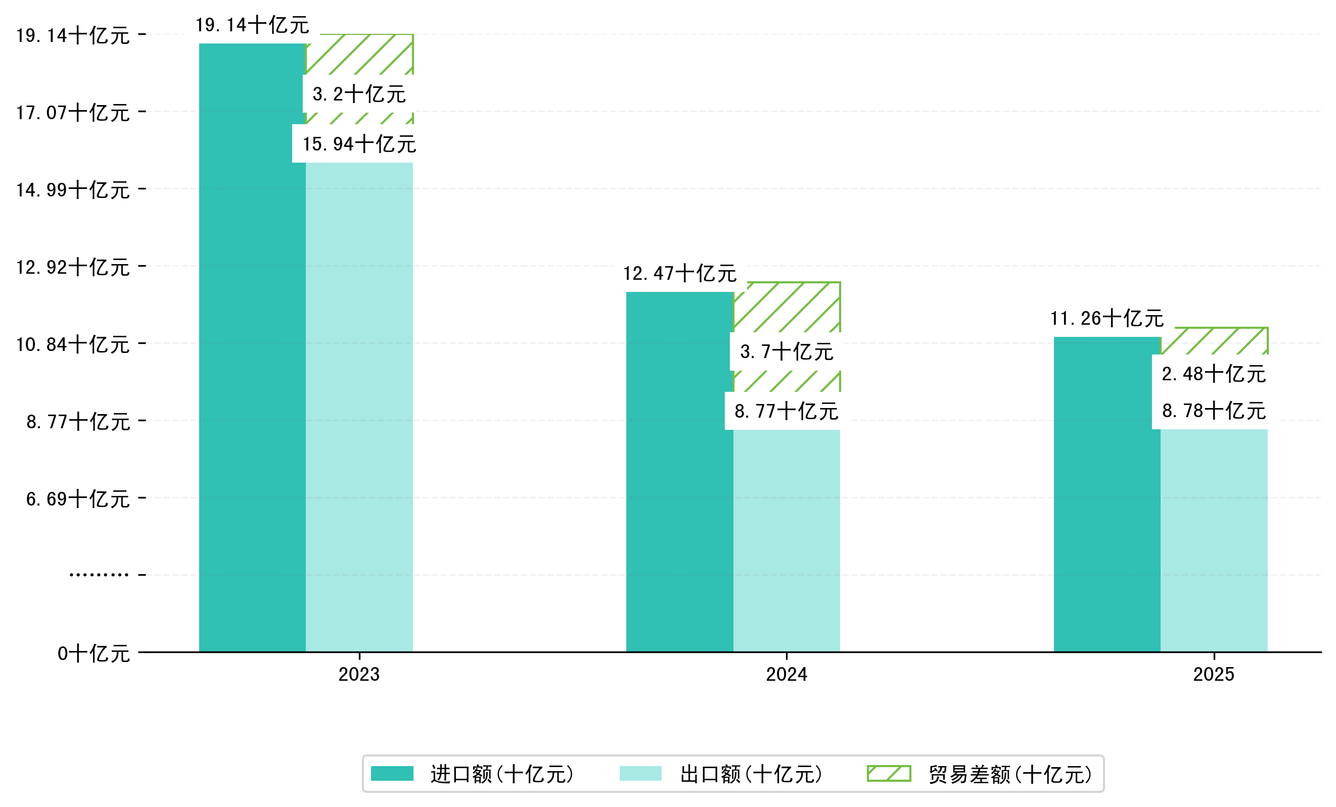 以人民币计,2025年3月南宁市贸易差额为3,1854,3978万元(贸易逆差),相比上月增加了6,9329,2979万元,即9595,6101万美元;相比上年同期增加了3,6319,2280万元,同比增加-53.27%。