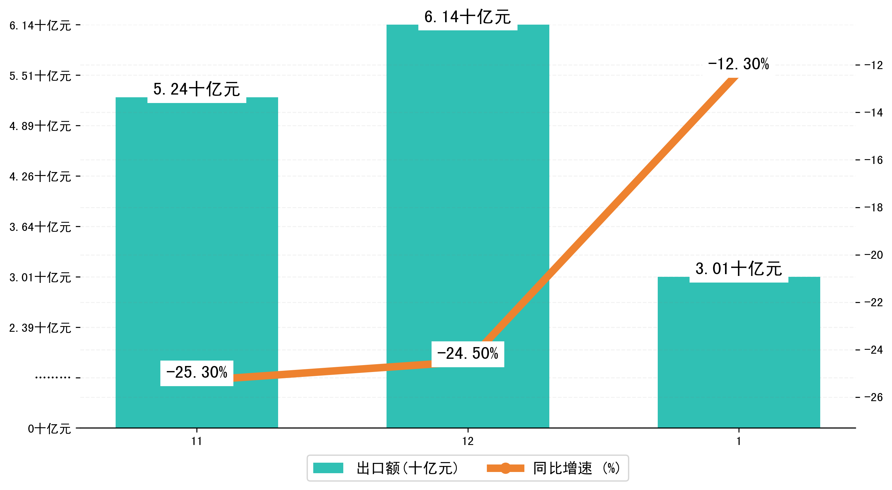 以人民币计,2025年1-1月南宁市出口额为30,1103.7523万元,相比上年同期减少了7,2752.784万元,同比减少了-12.30%。