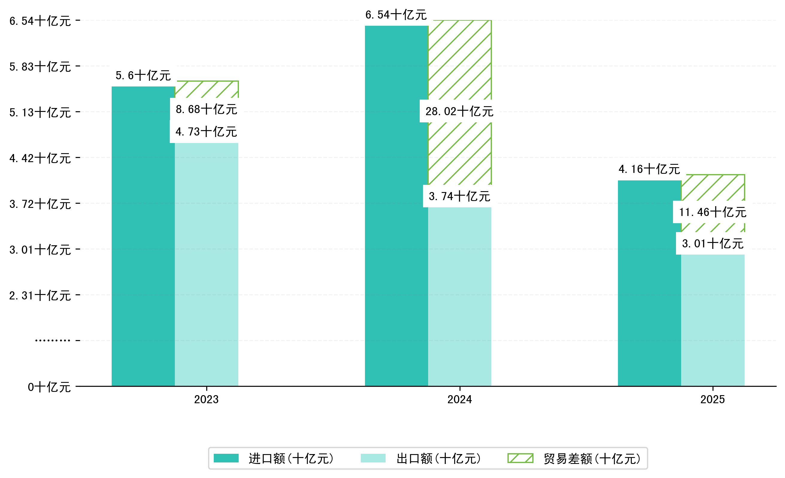 以人民币计,2025年1月南宁市贸易差额为11,4570,1129万元(贸易逆差),相比上月减少了26,6474,4158万元,即3,7034,1405万美元;相比上年同期增加了16,5645,8880万元,同比增加-59.11%。