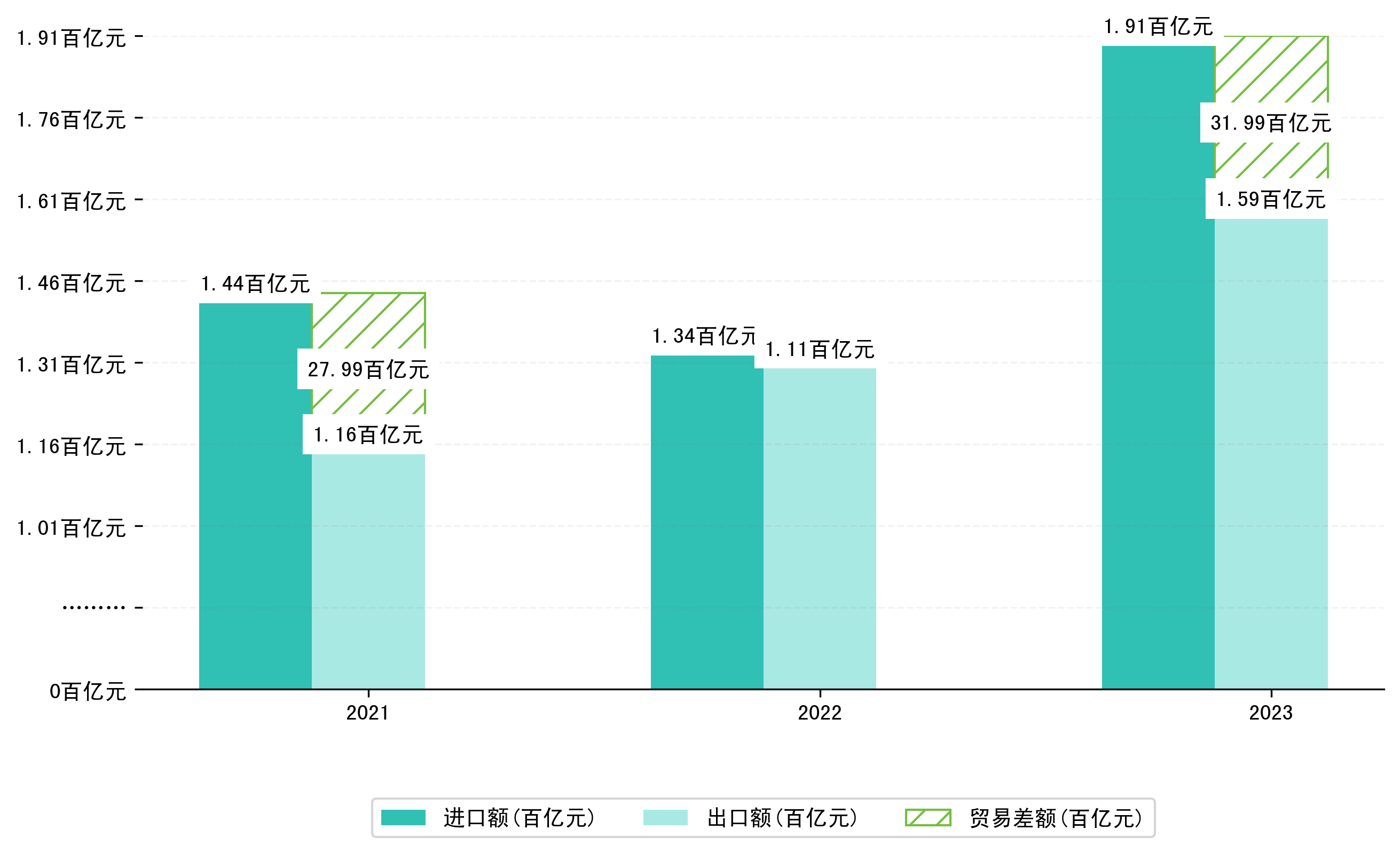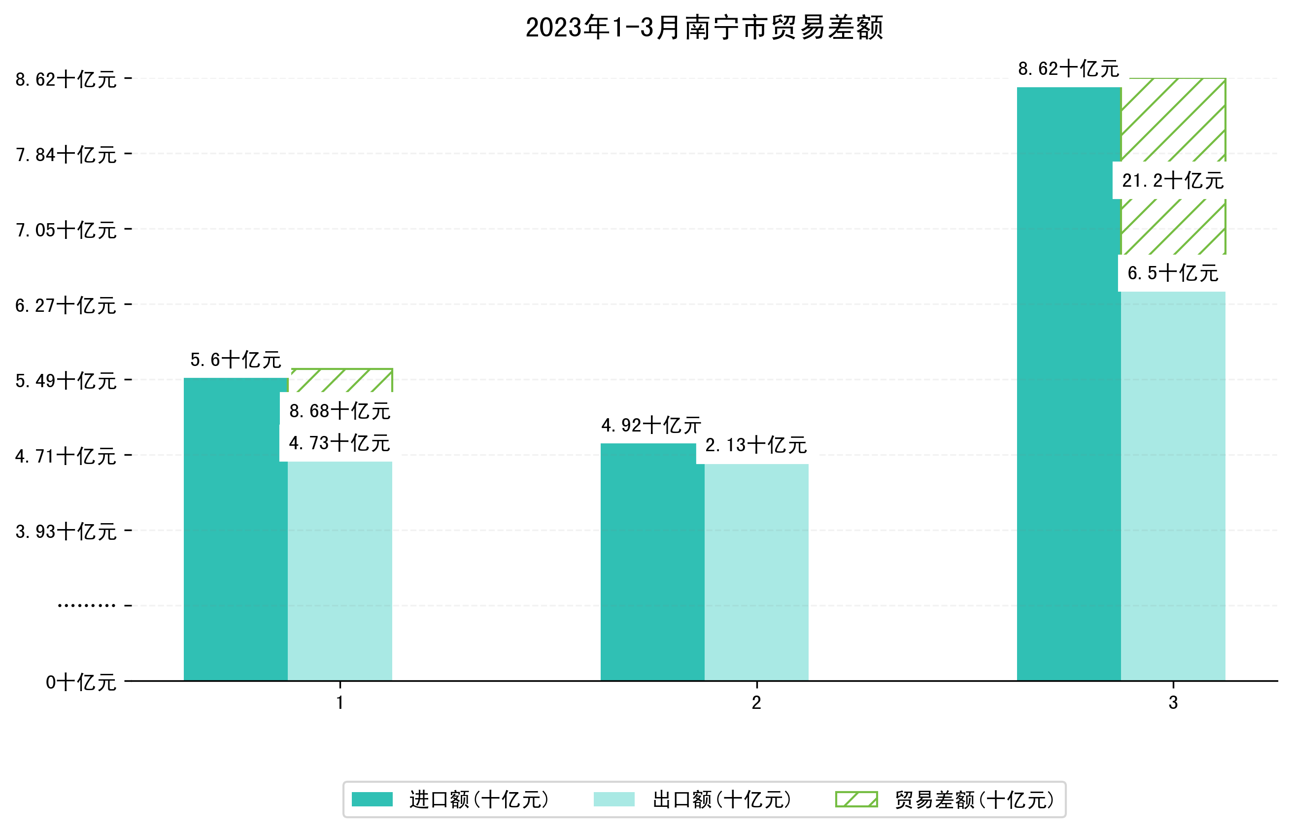 以美元计,2023年1-3月南宁市贸易差额为4,6832,6393万美元(贸易逆差),相比上年同期减少了4,5076,7095万美元,同比减少2567.11%。