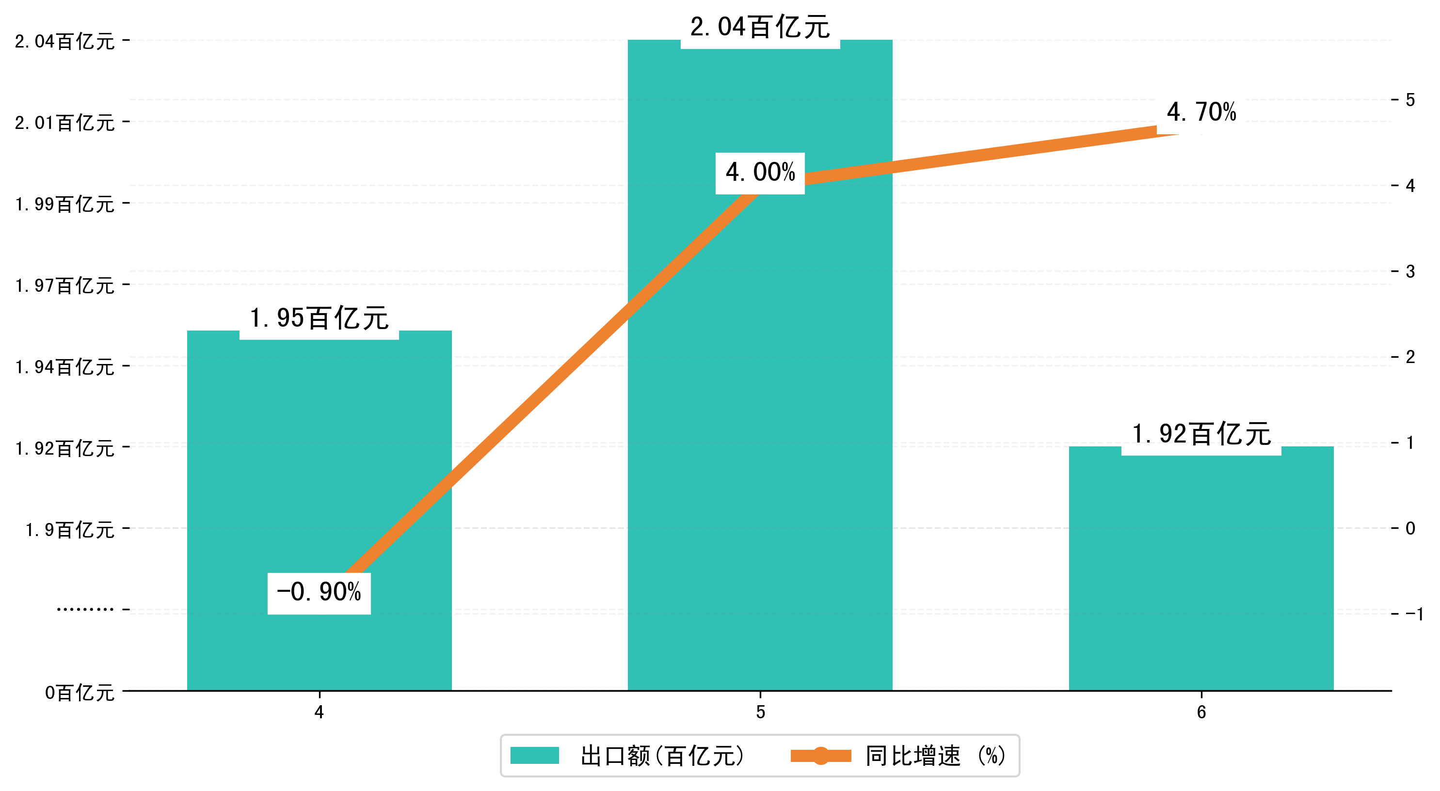 以人民币计,2024年6月南通市出口额为192,1633.1973万元,相比上月减少了11,5427.5454万元;相比上年同期增加了13,9358.18万元,同比增加了4.70%。