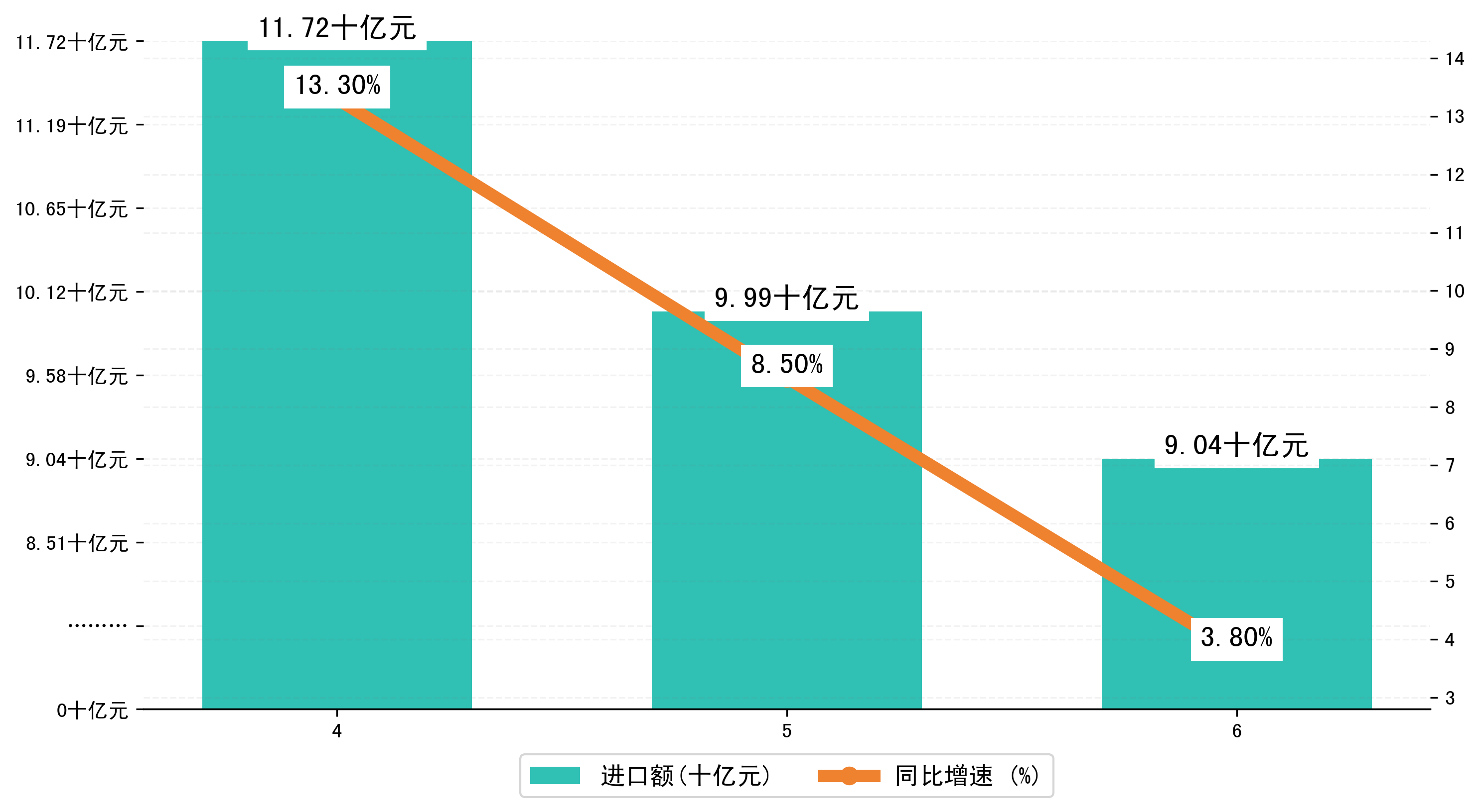 以人民币计,2024年1-6月南通市进口额为614,4256.0694万元,相比上年同期增加了4,0662.1932万元,同比增加了3.80%。