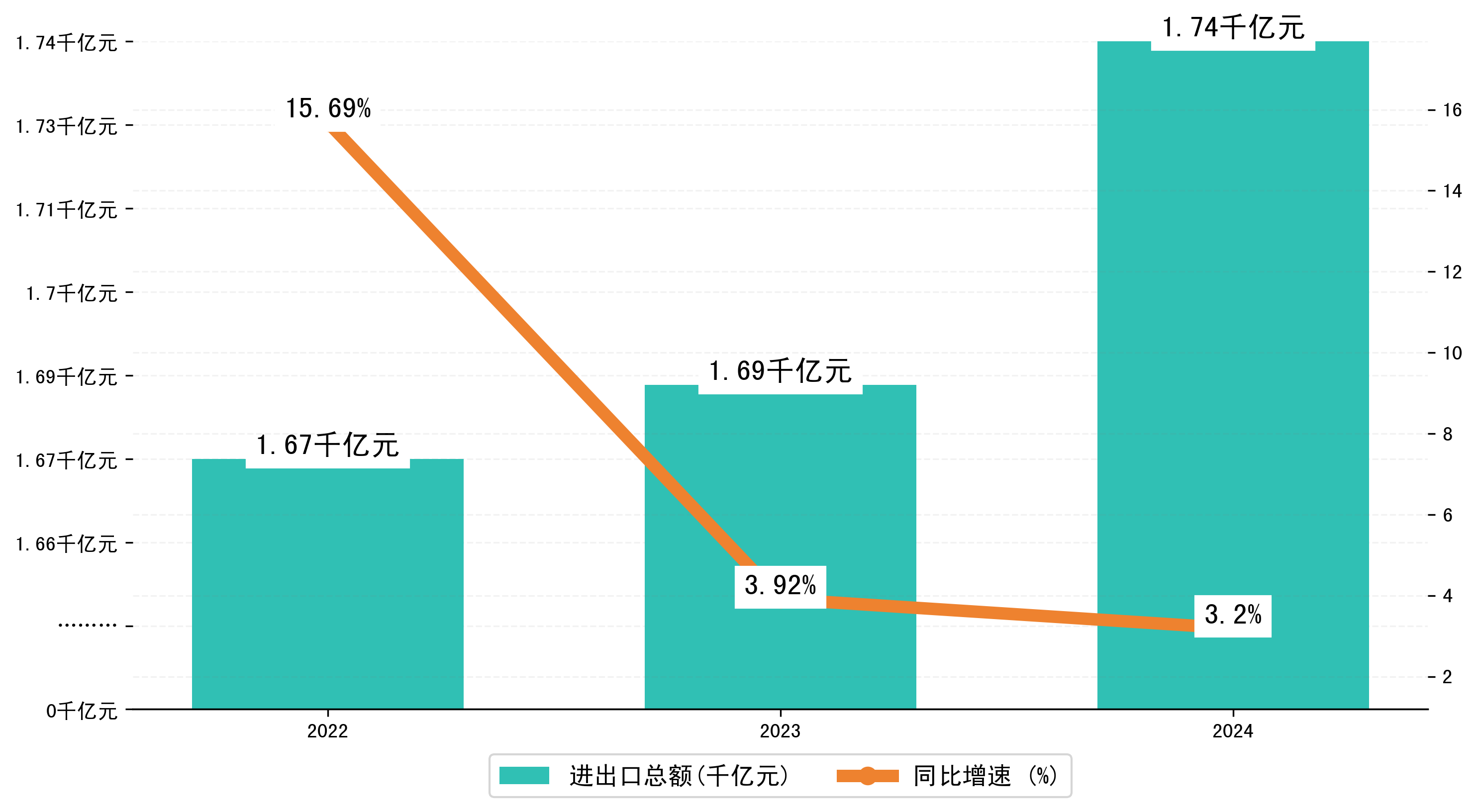 以人民币计,2024年1-6月南通市进出口总额为1739,5518.4173万元,相比上年同期增加了53,9514.9466万元,同比增加了4.40%。