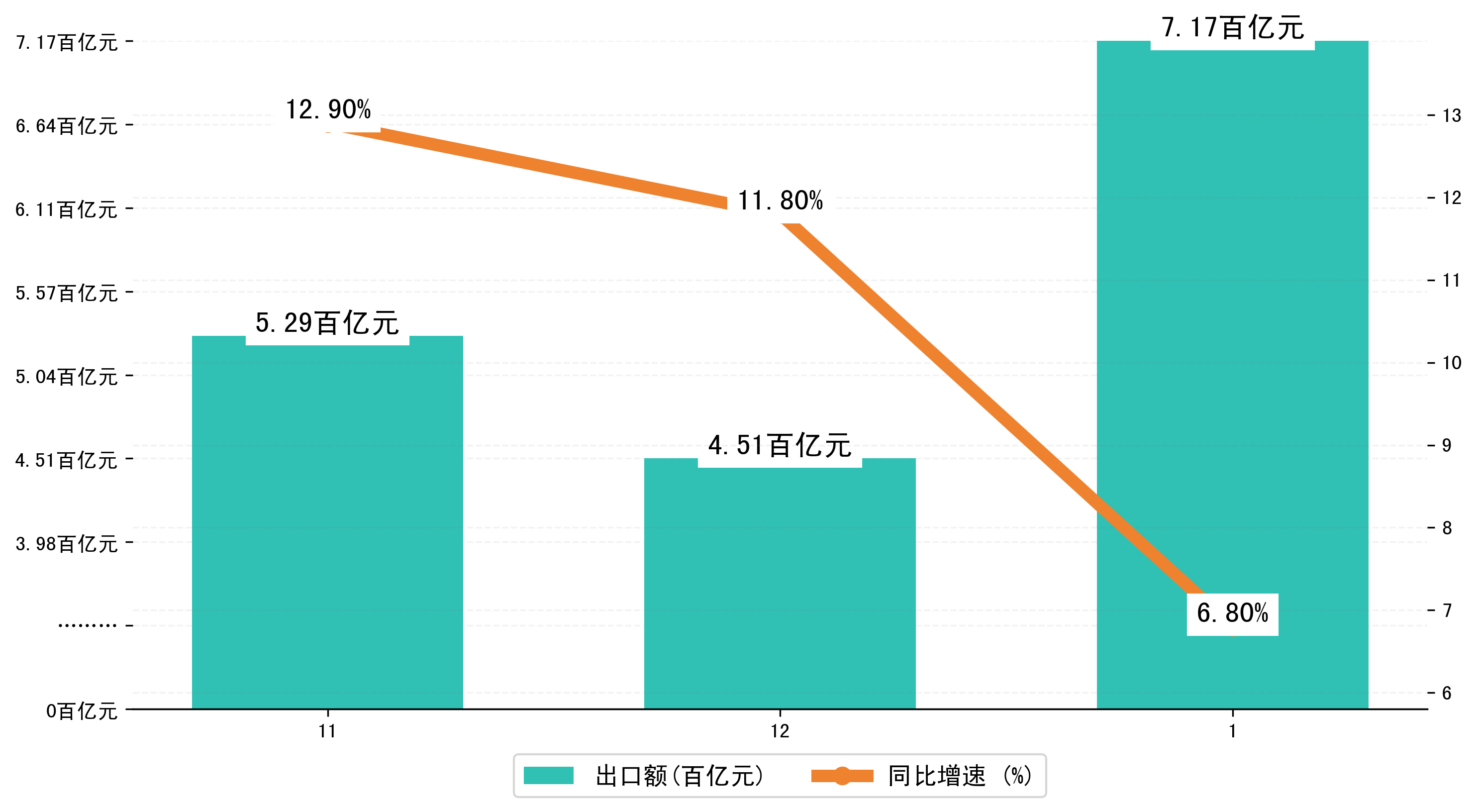 以人民币计,2023年1月金华市出口额为717,0081.238万元,相比上月增加了265,8657.514万元;相比上年同期增加了45,4735.4205万元,同比增加了6.80%。