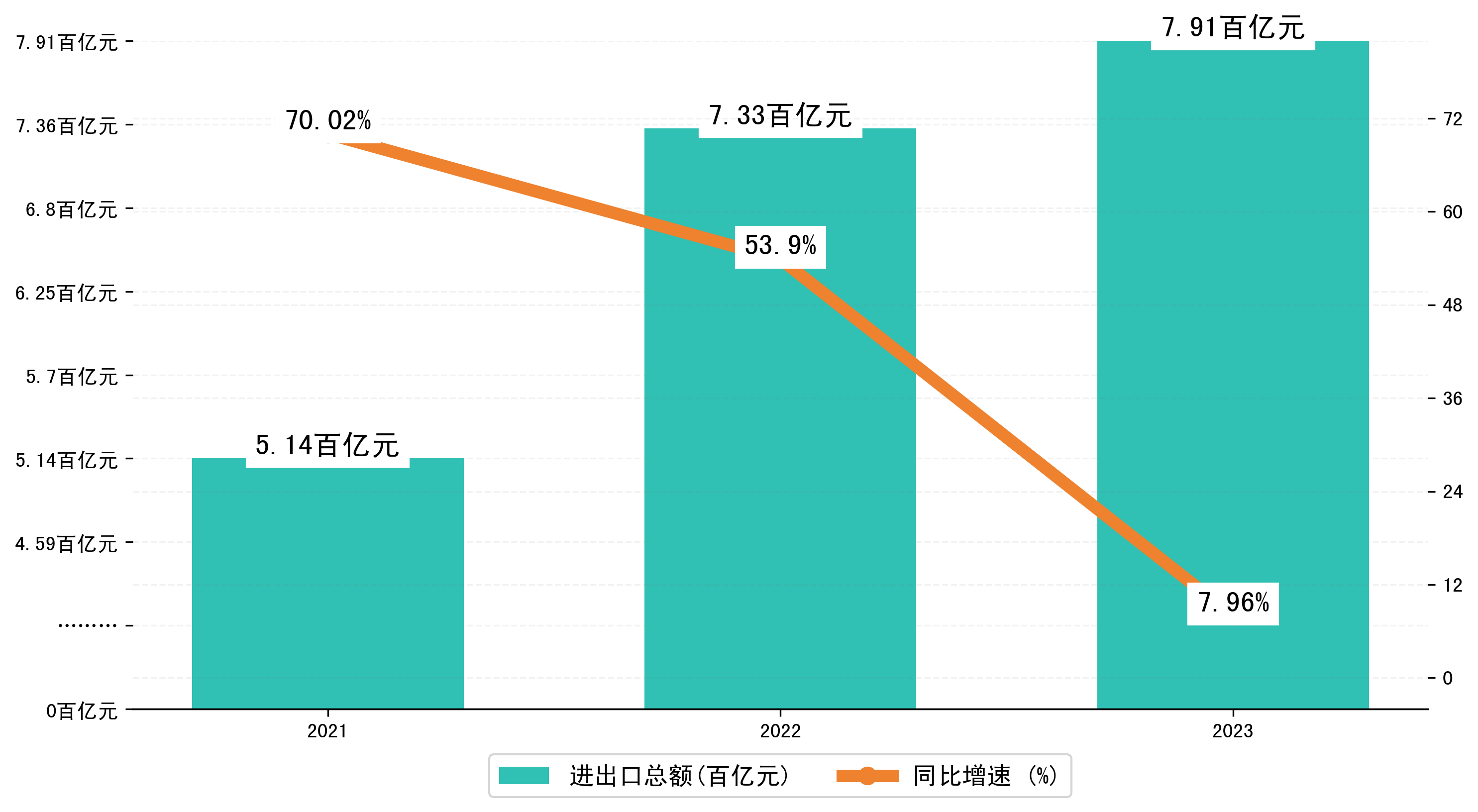 以人民币计,2023年1月金华市进出口总额为791,2245.3379万元,相比上月增加了242,6740.0696万元;相比上年同期增加了58,3577.8311万元,同比增加了8.00%。