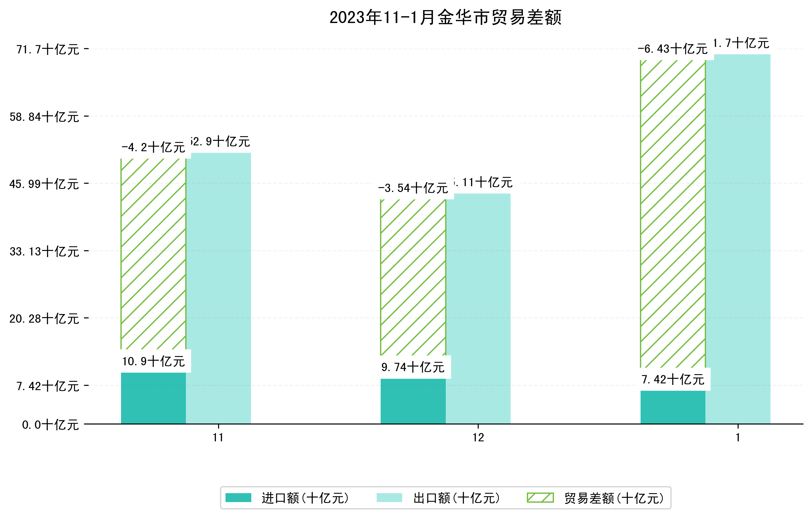 以人民币计,2023年1-1月金华市贸易差额为642,7917,1381万元(贸易顺差),相比上年同期增加了32,5893,0099万元,同比增加5.34%。