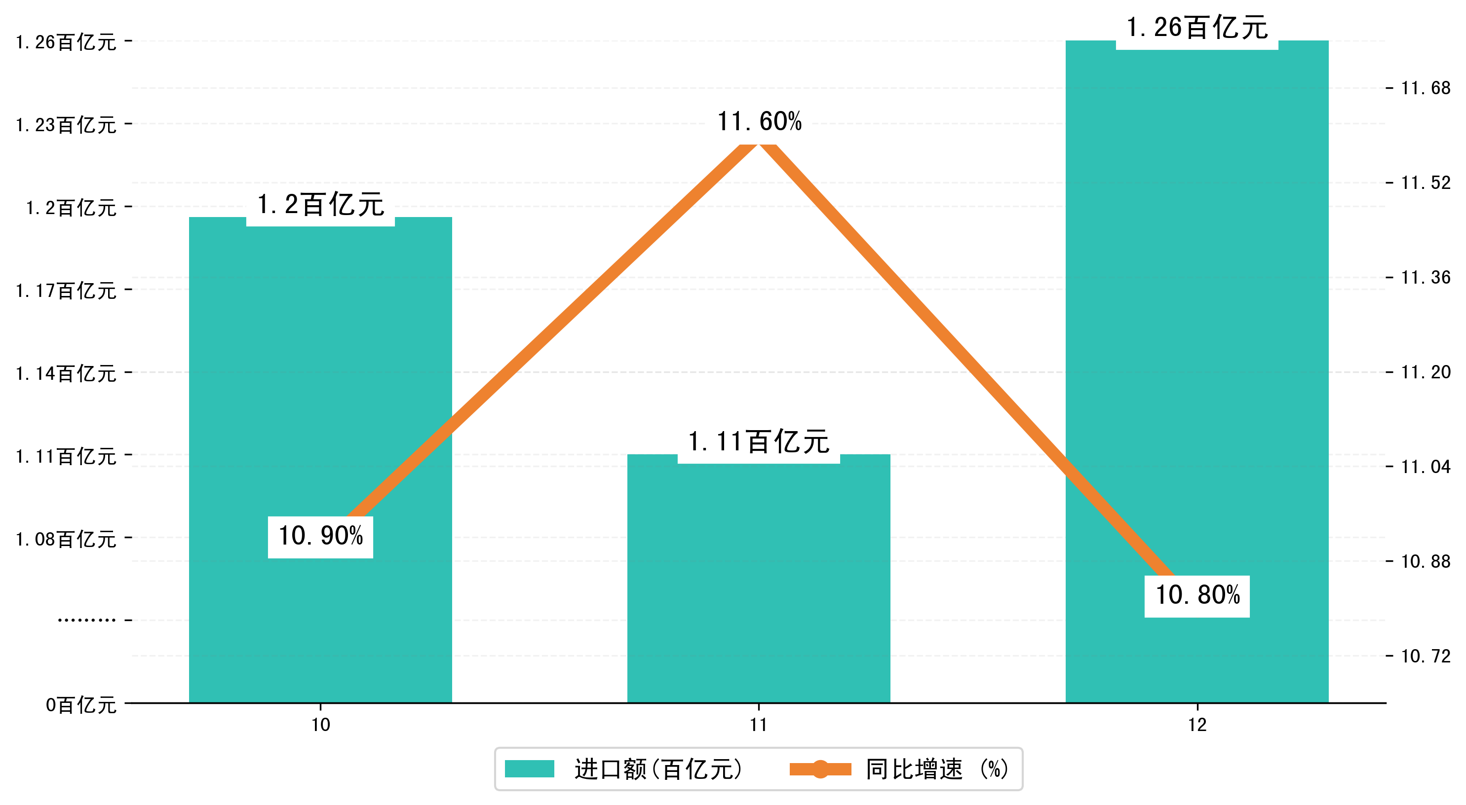 以人民币计,2024年12月南通市进口额为125,6926.895万元,相比上月增加了14,3855.4975万元;相比上年同期增加了4,7319.1016万元,同比增加了10.80%。