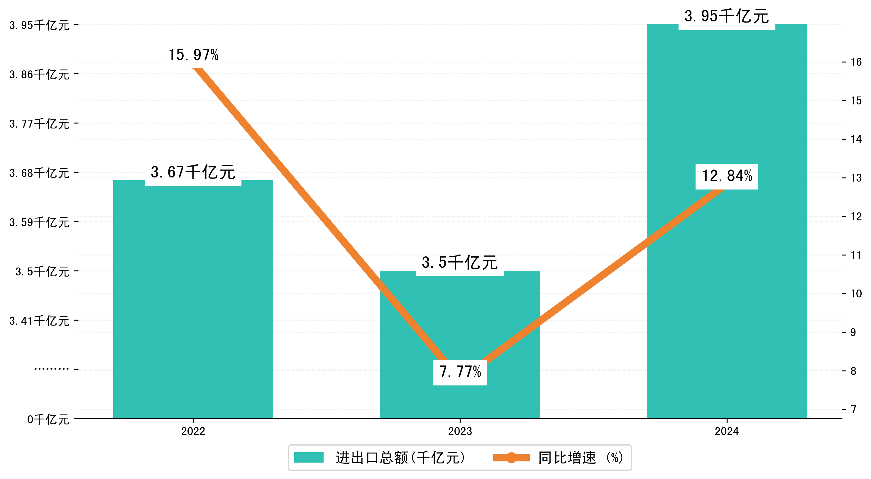 以人民币计,2024年1-12月南通市进出口总额为3949,8741.3548万元,相比上年同期增加了449,5819.0956万元,同比增加了12.90%。