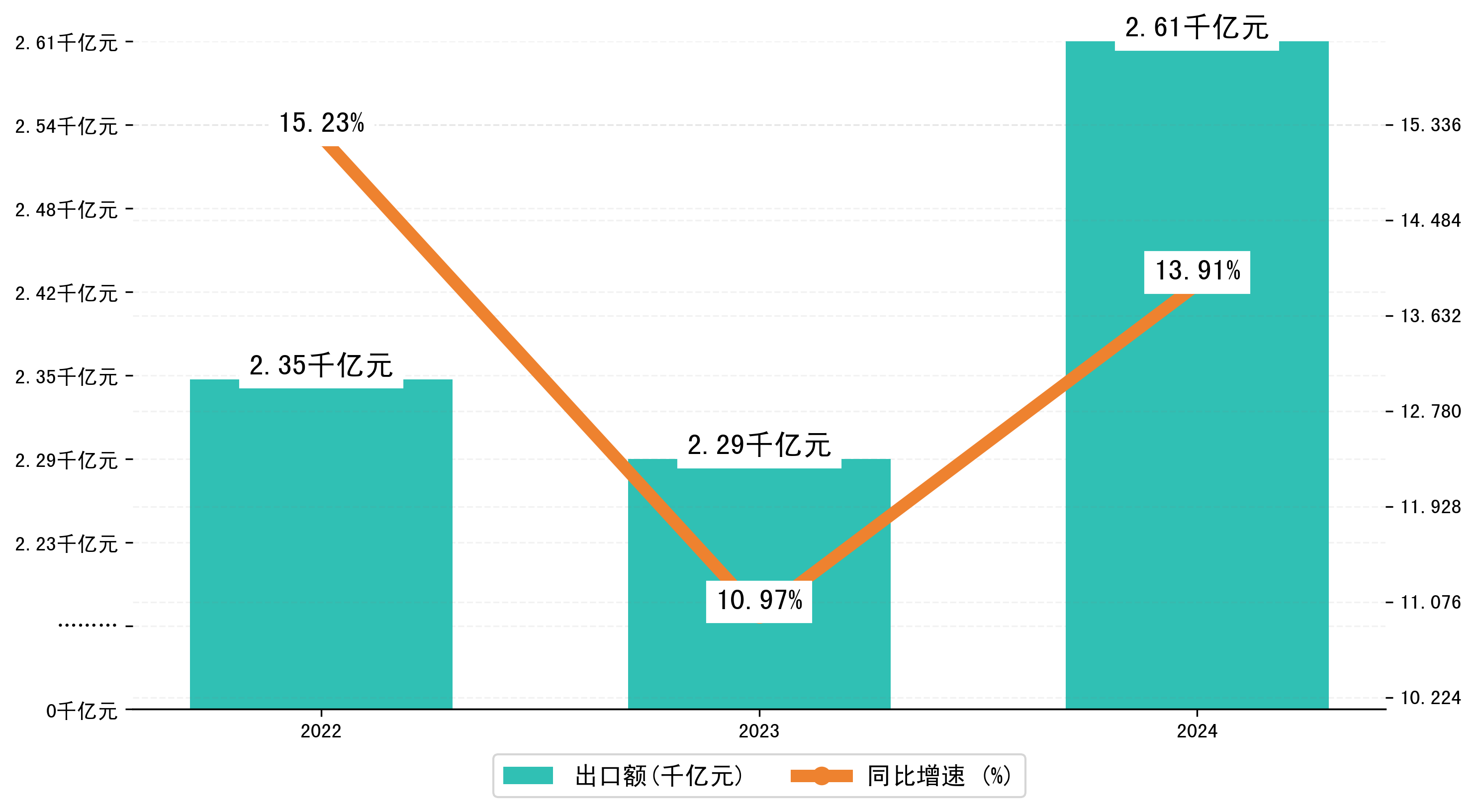 以人民币计,2024年1-12月南通市出口额为2608,1506.1842万元,相比上年同期增加了318,4573.2544万元,同比增加了13.90%。