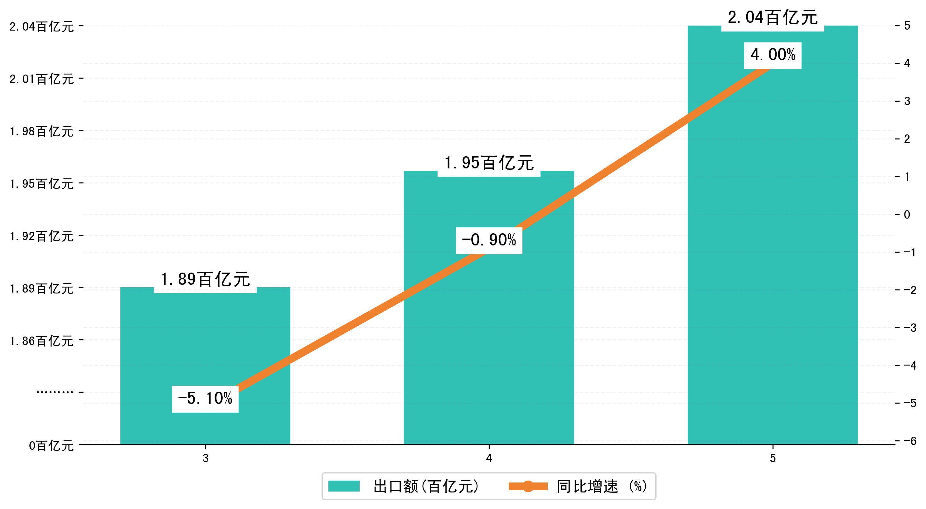 以人民币计,2024年5月南通市出口额为203,7060.7427万元,相比上月增加了8,2532.3954万元;相比上年同期增加了44,9229.152万元,同比增加了4.00%。