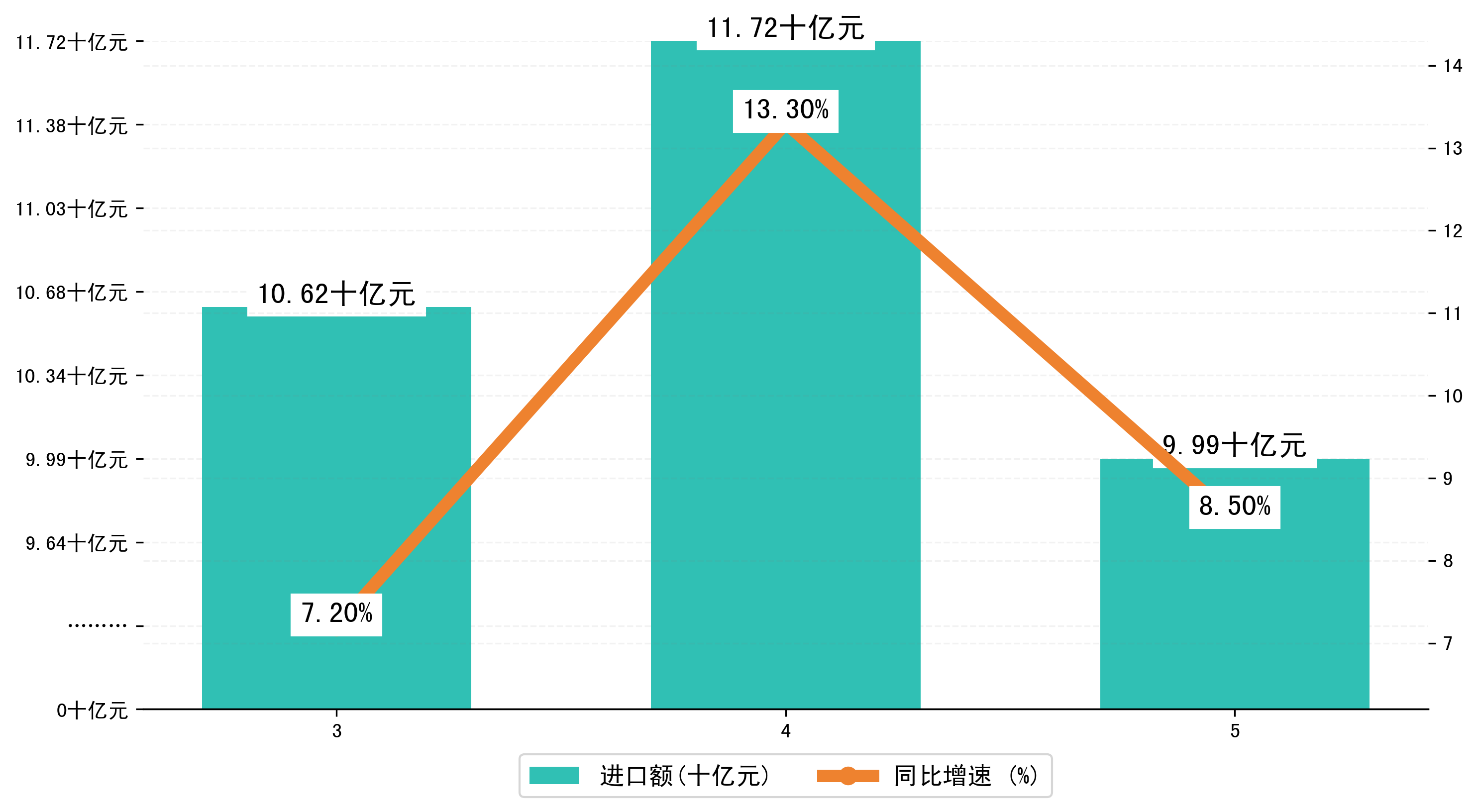 以人民币计,2024年5月南通市进口额为99,8863.5138万元,相比上月减少了17,3551.1102万元;相比上年同期减少了8,7023.4854万元,同比增加了8.50%。