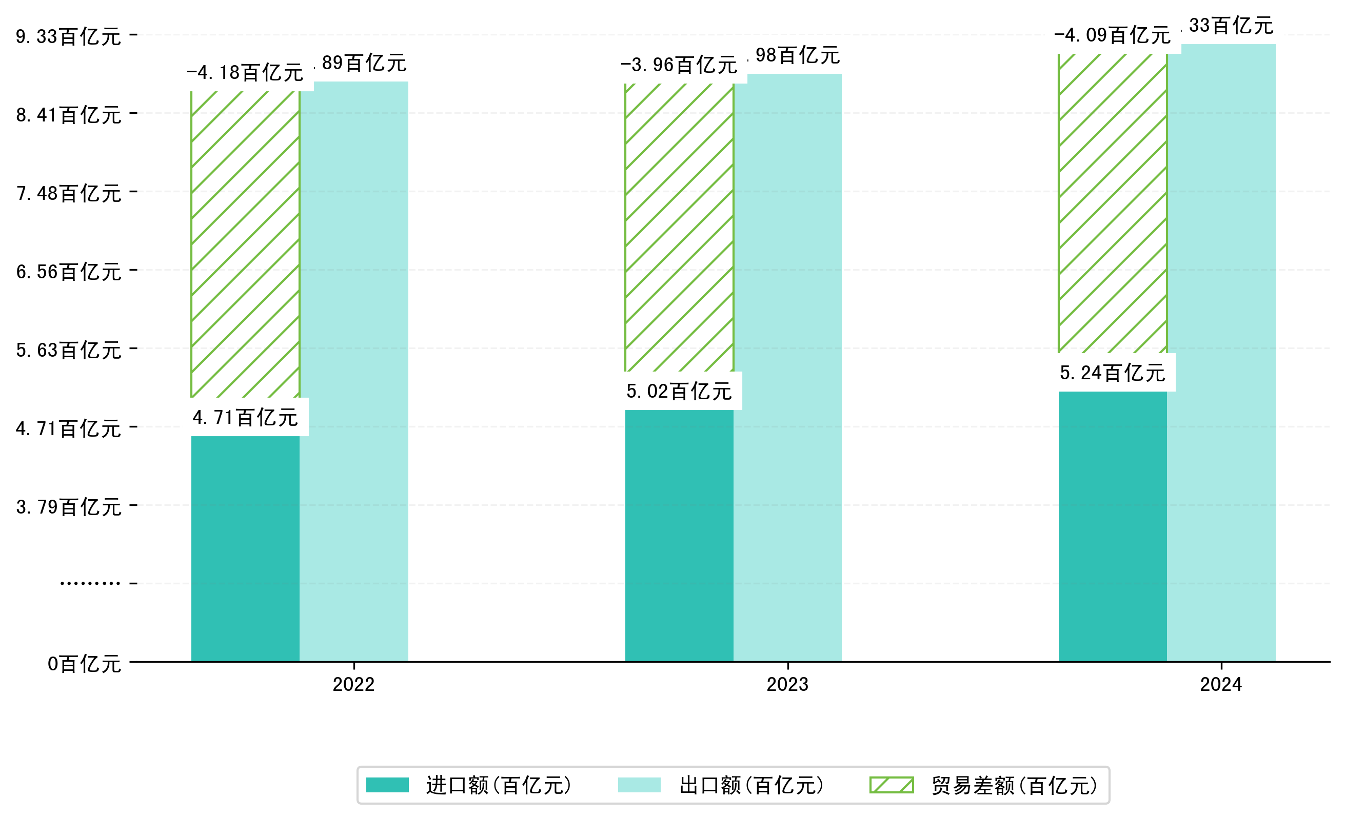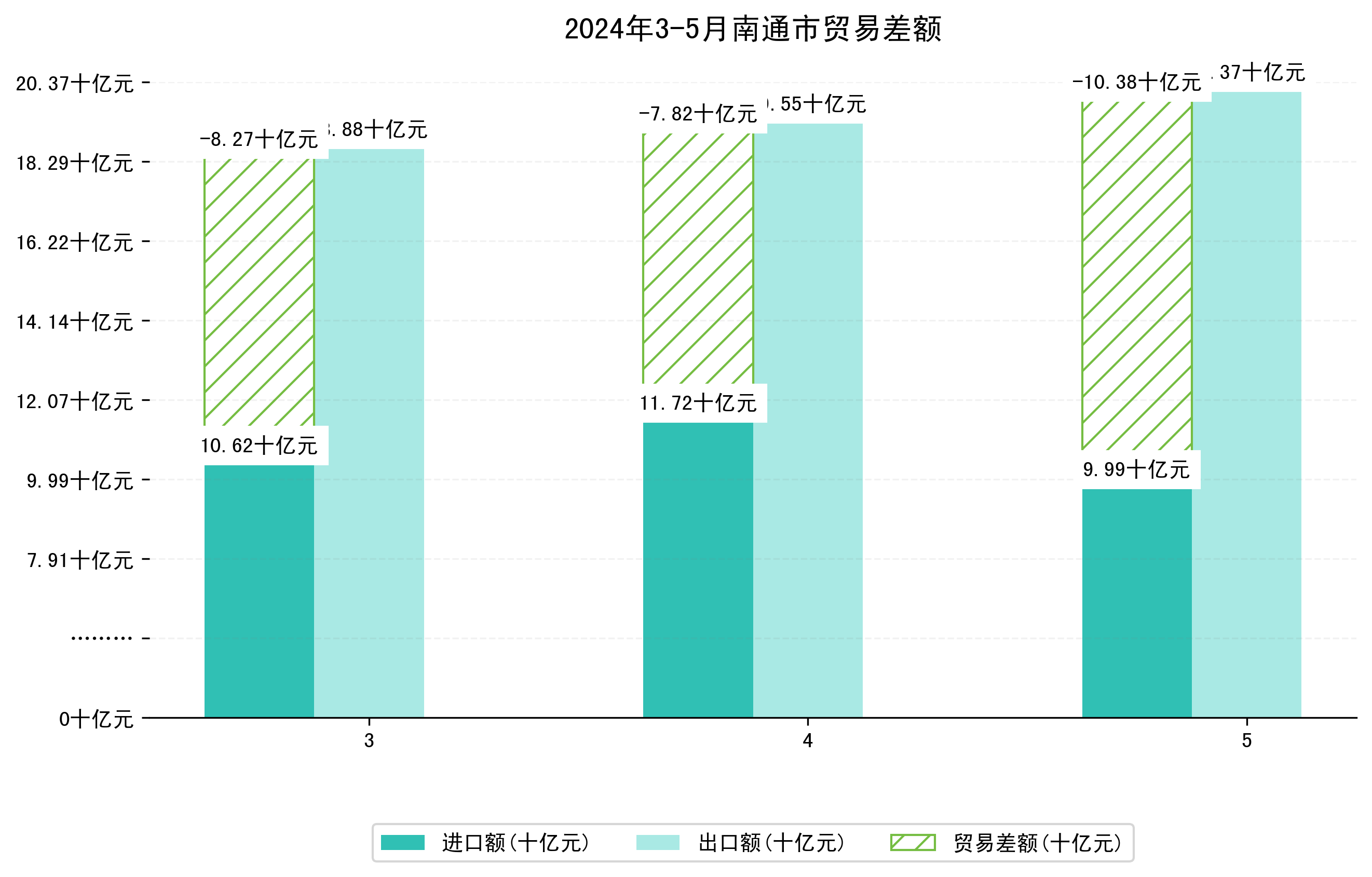 以人民币计,2024年5月南通市贸易差额为103,8197,2289万元(贸易顺差),相比上月增加了25,6083,5056万元,即3,5969,5608万美元;相比上年同期增加了53,6252,6374万元,同比增加106.84%。