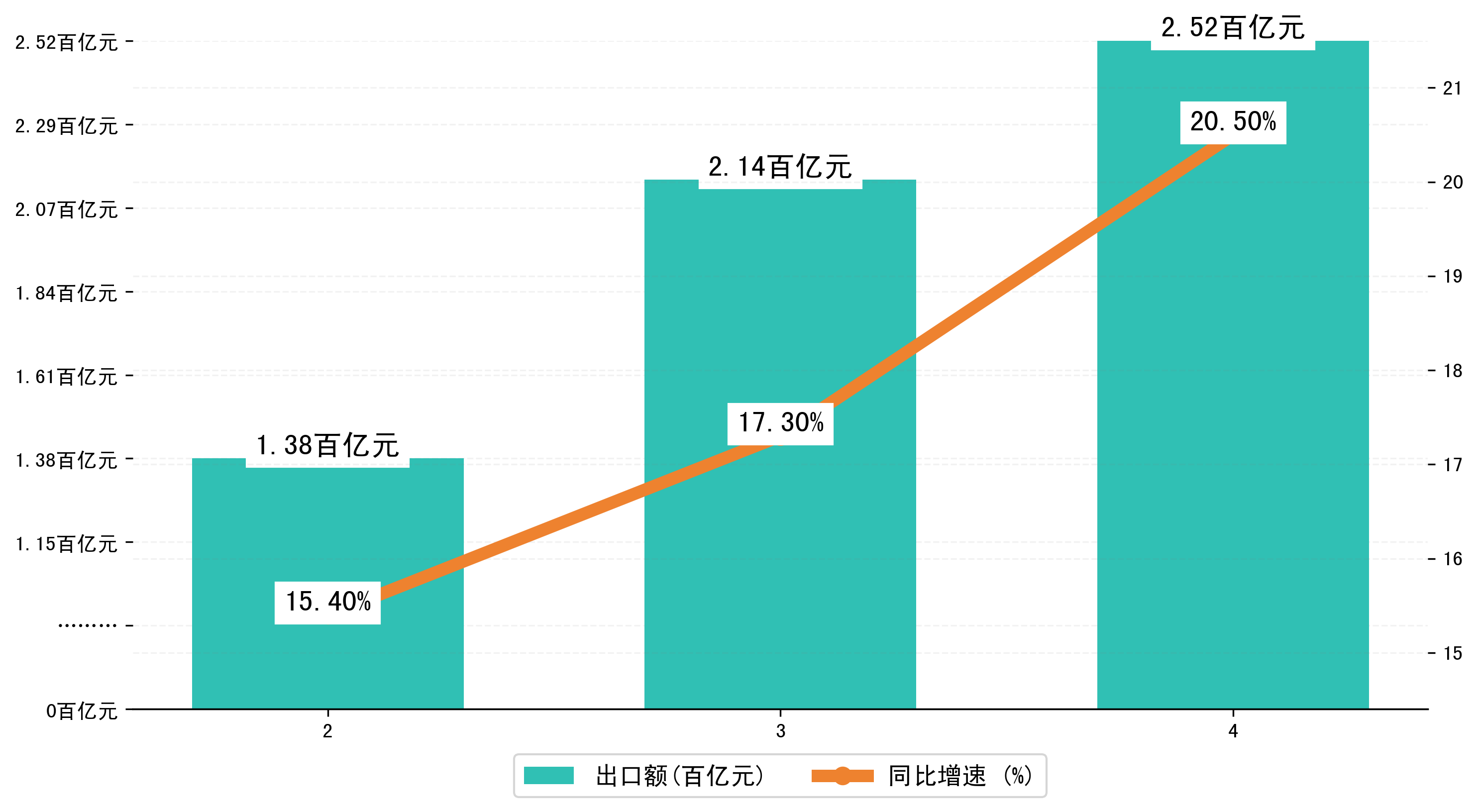 以人民币计,2025年4月南通市出口额为252,1873.8071万元,相比上月增加了38,0180.6995万元;相比上年同期增加了56,7345.4598万元,同比增加了20.50%。