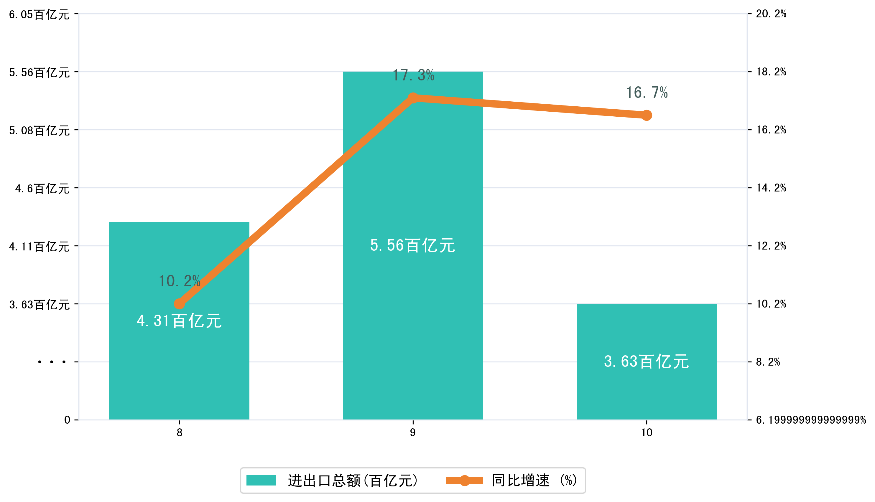 以人民币计,2025年10月南通市进出口总额为362,8465.8814万元,相比上月减少了193,6226.5032万元;相比上年同期增加了38,2759.5608万元,同比增加了16.70%。