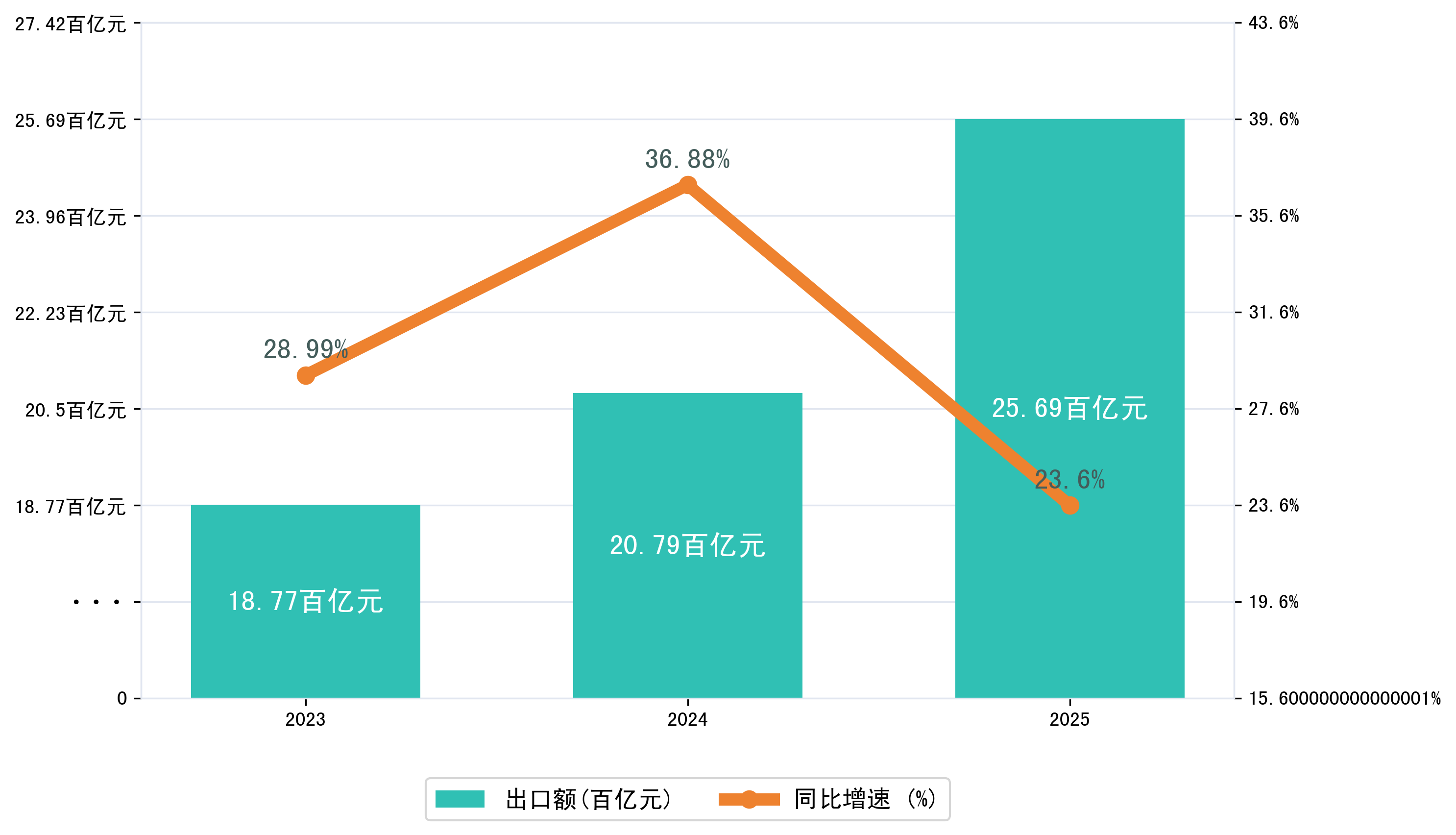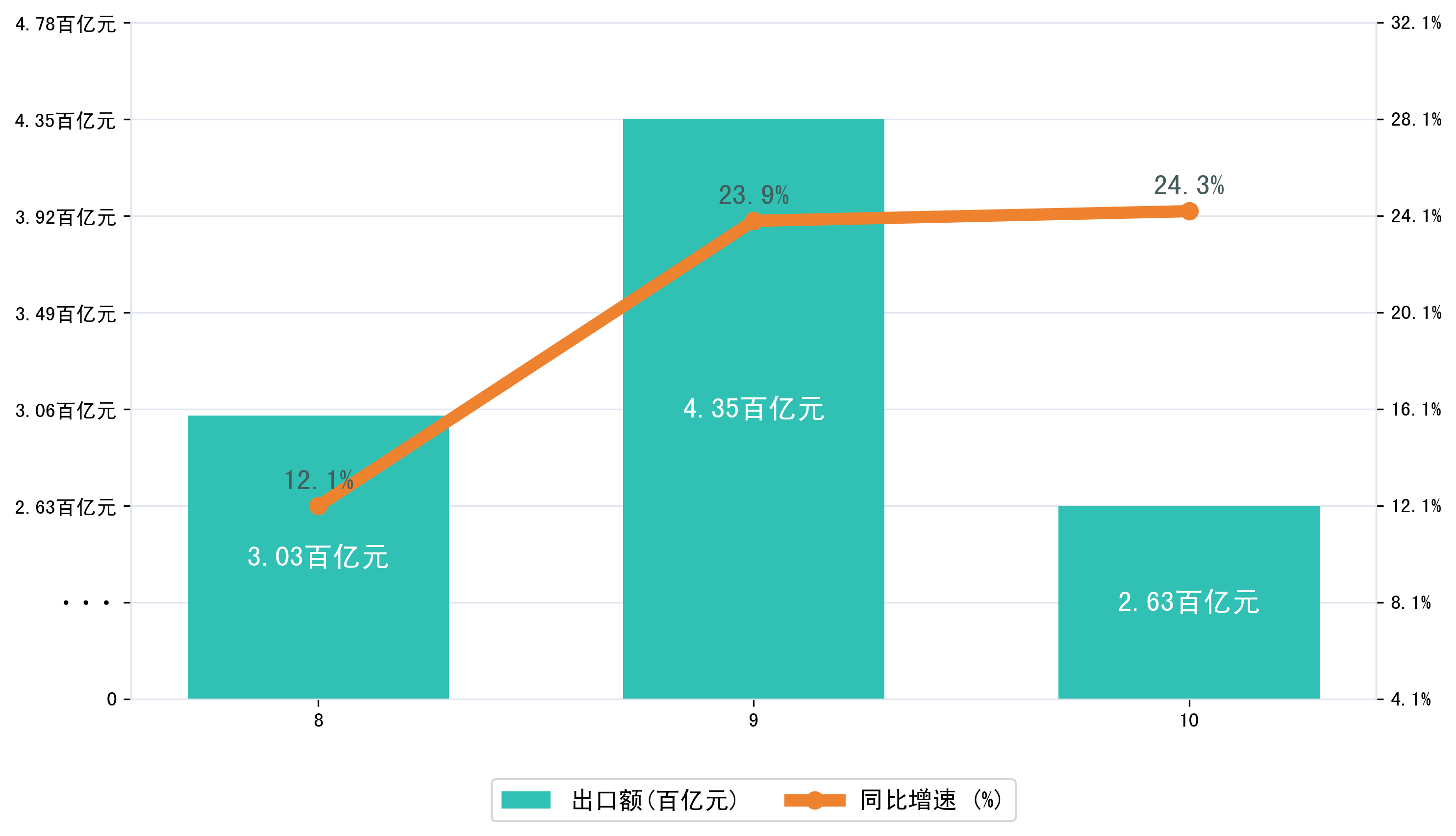 以人民币计,2025年1-10月南通市出口额为2569,3909.1653万元,相比上年同期增加了490,5128.3402万元,同比增加了24.30%。