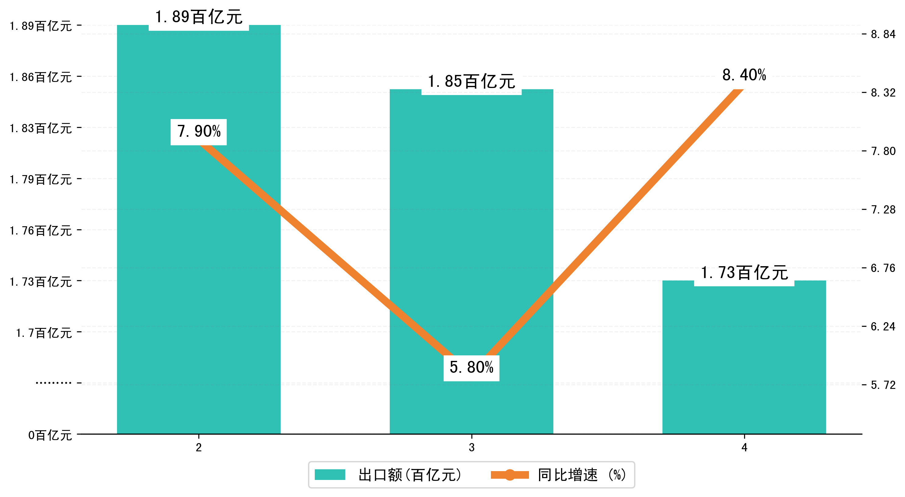 以人民币计,2023年1-4月南通市出口额为739,5026.9726万元,相比上年同期增加了53,2351.0083万元,同比增加了8.40%。