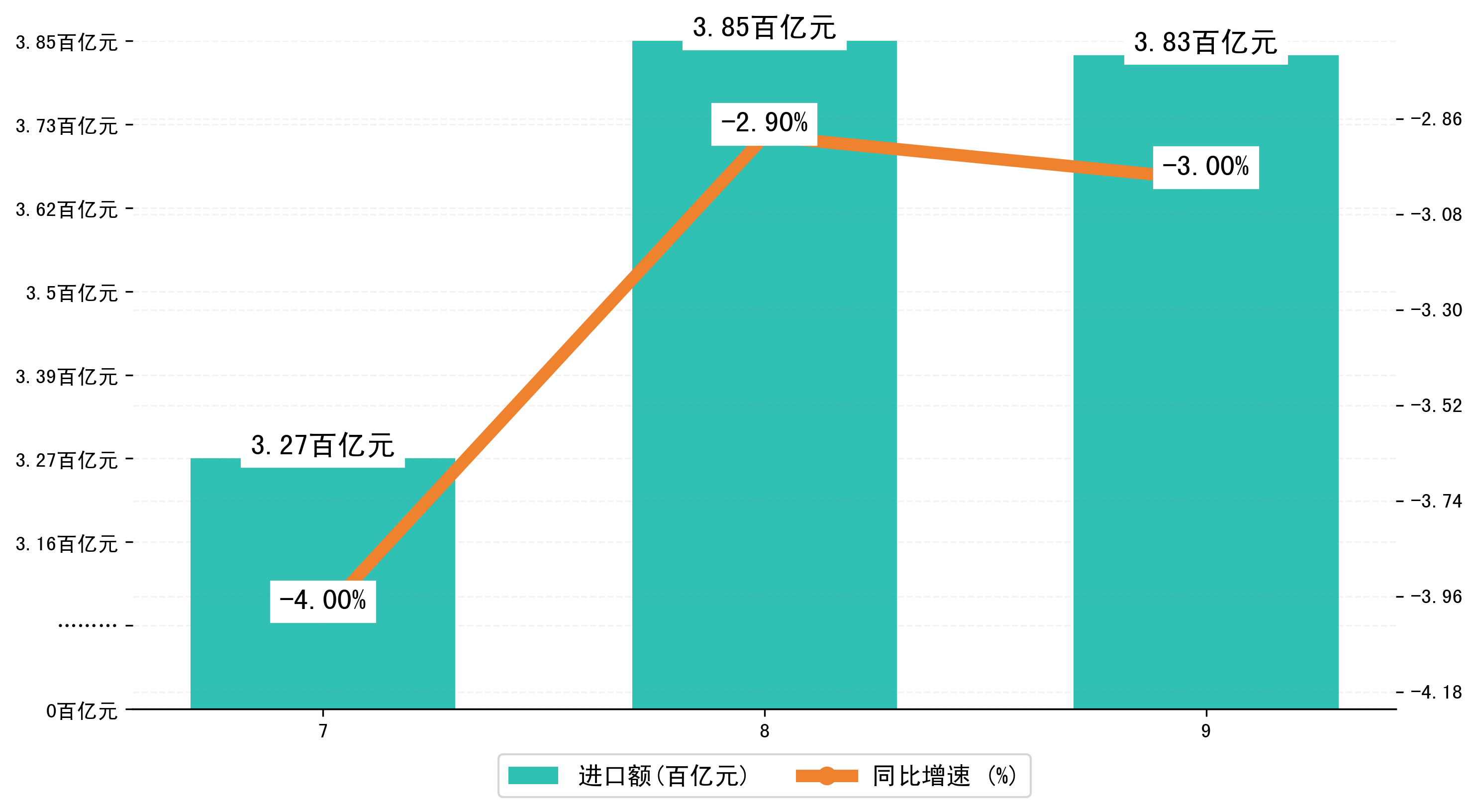 以人民币计,2023年1-9月宁波市进口额为3265,8349.9117万元,相比上年同期减少了116,0035.8691万元,同比减少了-3.00%。